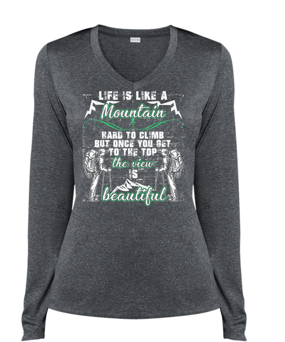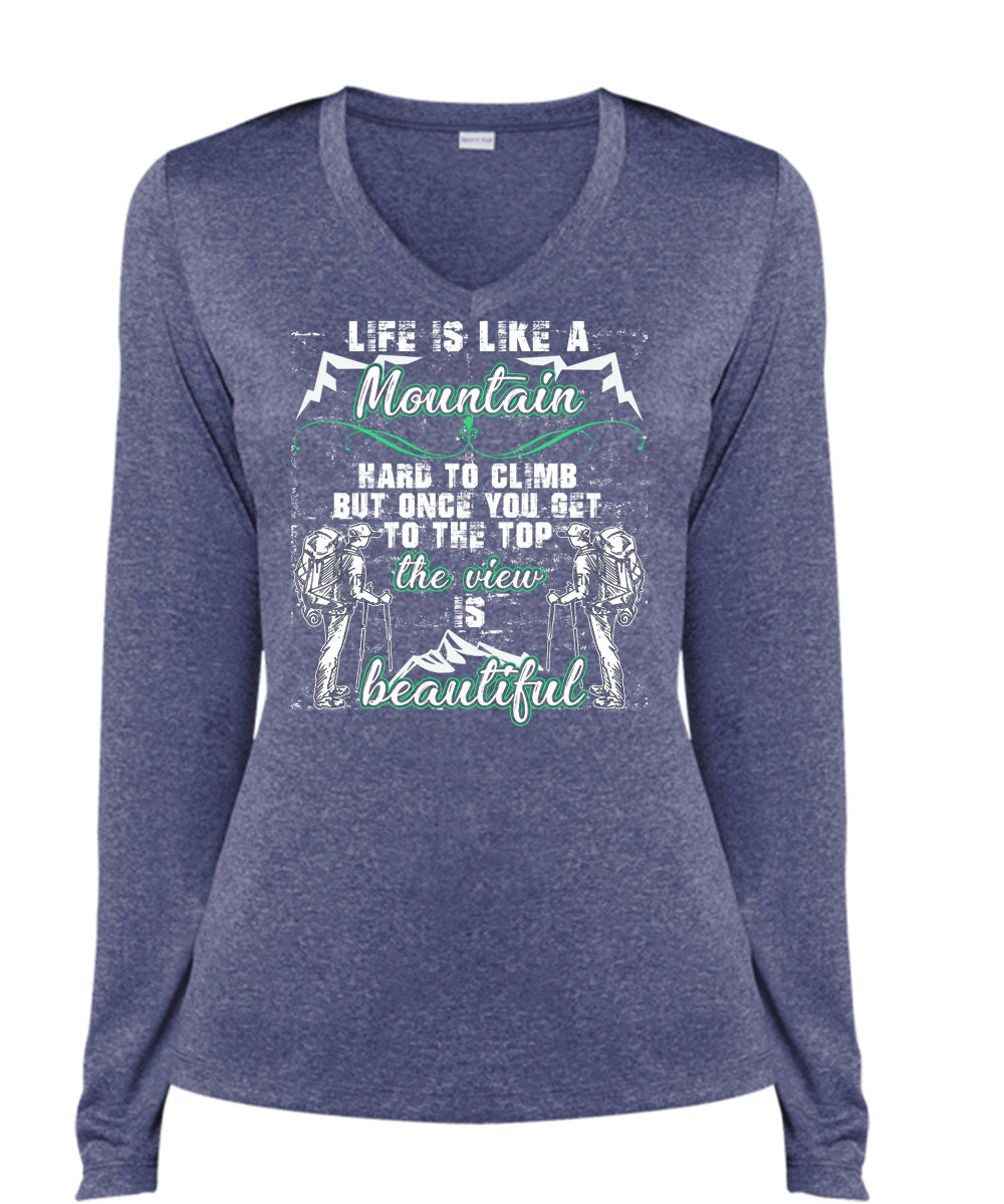 Life Is Like A Mountain T Shirt, The View Is Beautiful T Shirt, Cool Shirt (Ladies LS Heather V-Neck)