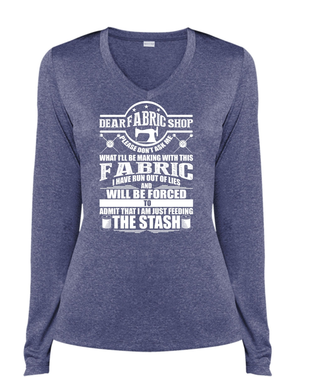 Making With This Fabric T Shirt, Dear Fabric Shop T Shirt, Cool Shirt (Ladies LS Heather V-Neck)