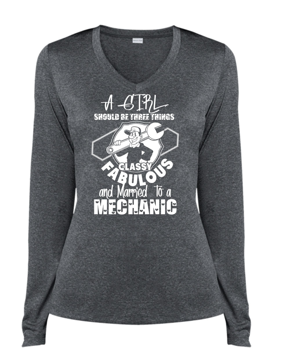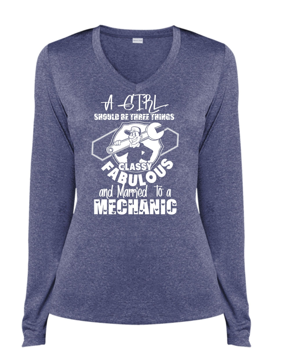 Married To A Mechanic T Shirt, A Girl Should Be Three Things T Shirt, Cool Shirt (Ladies LS Heather V-Neck)