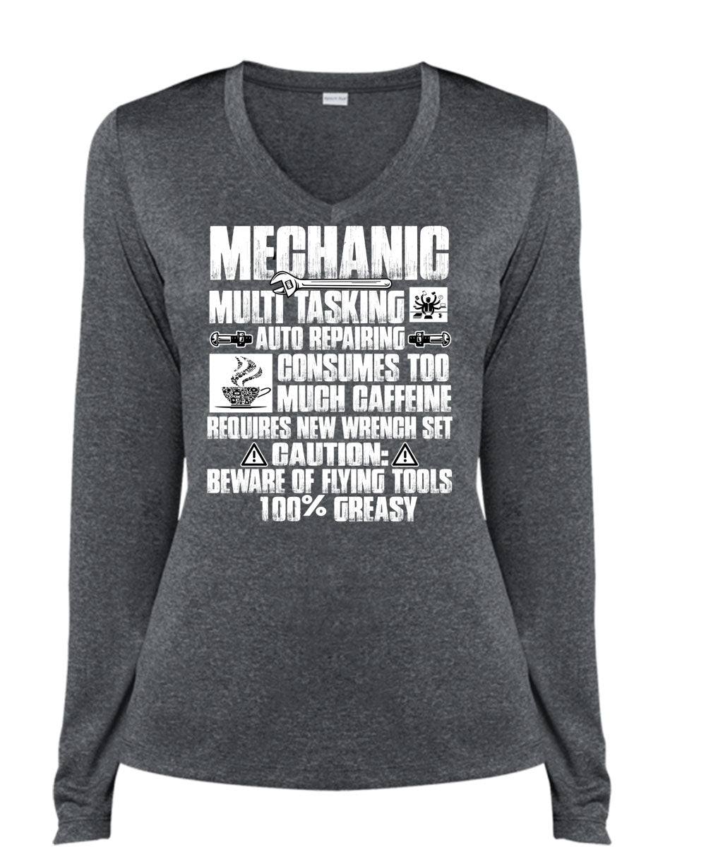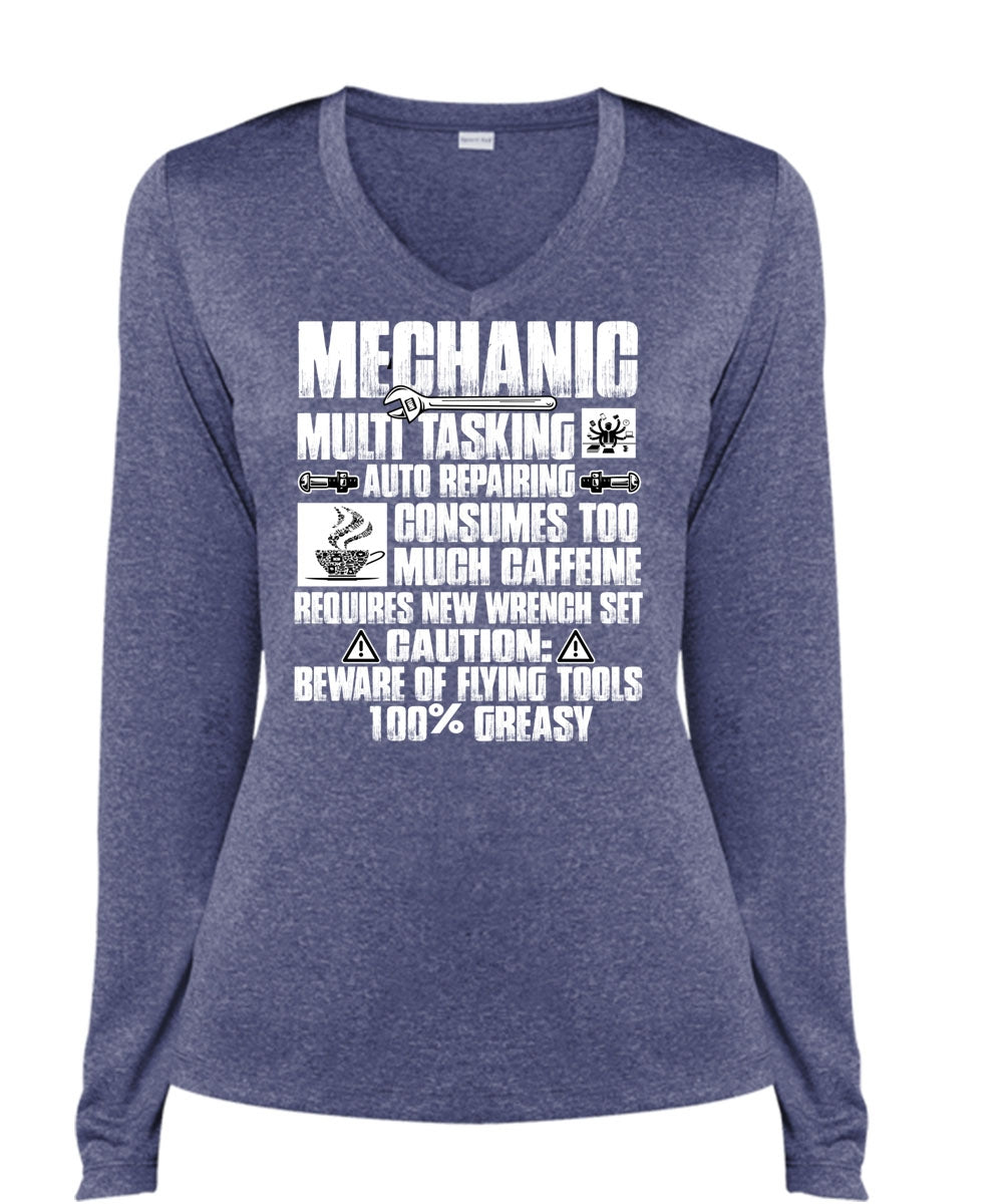 Mechanic Multitasking T Shirt, Much Caffeine T Shirt, Cool Shirt (Ladies LS Heather V-Neck)
