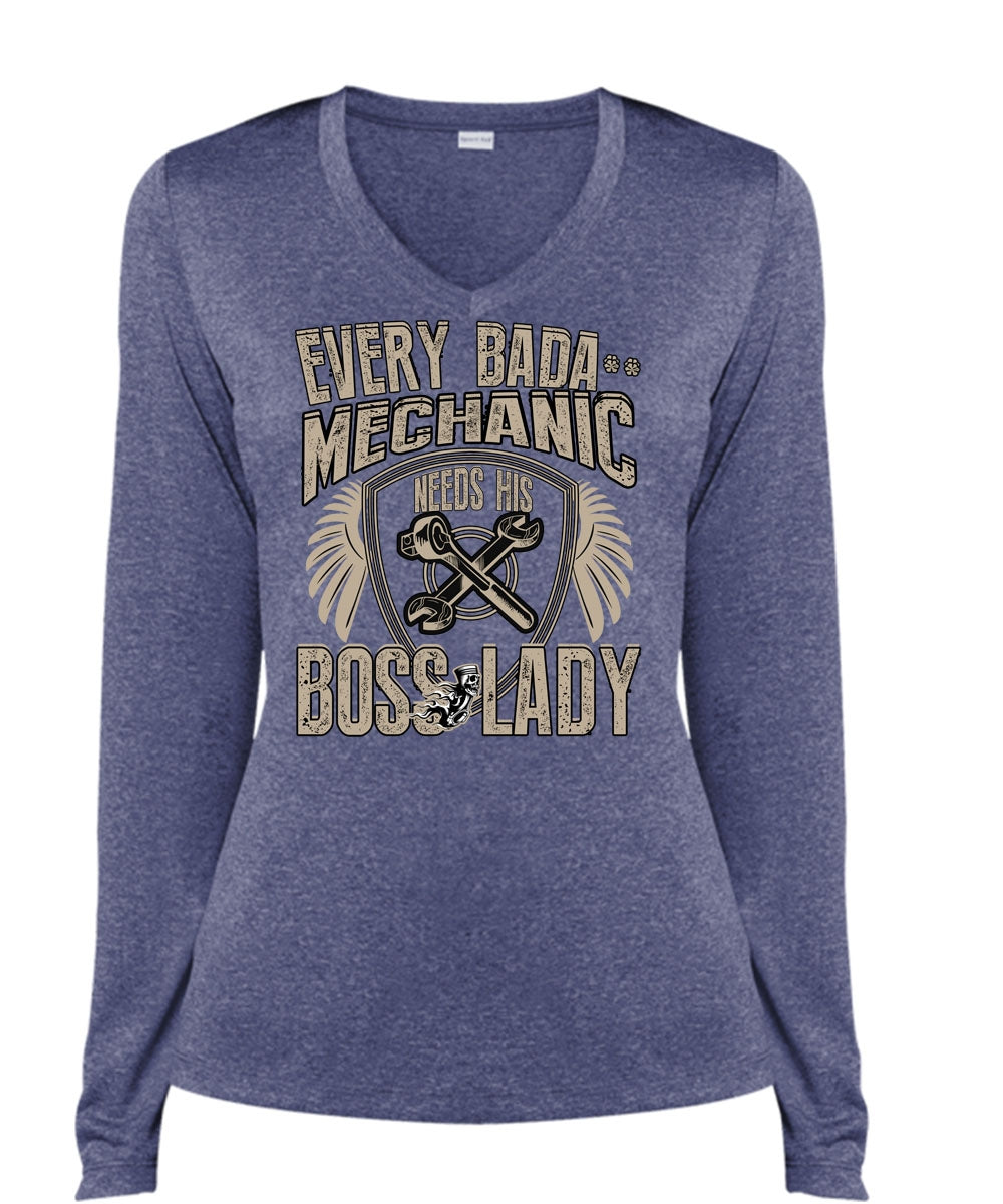 Mechanic Needs His Boss Lady T Shirt, Being A Mechanic T Shirt, Cool Shirt (Ladies LS Heather V-Neck)