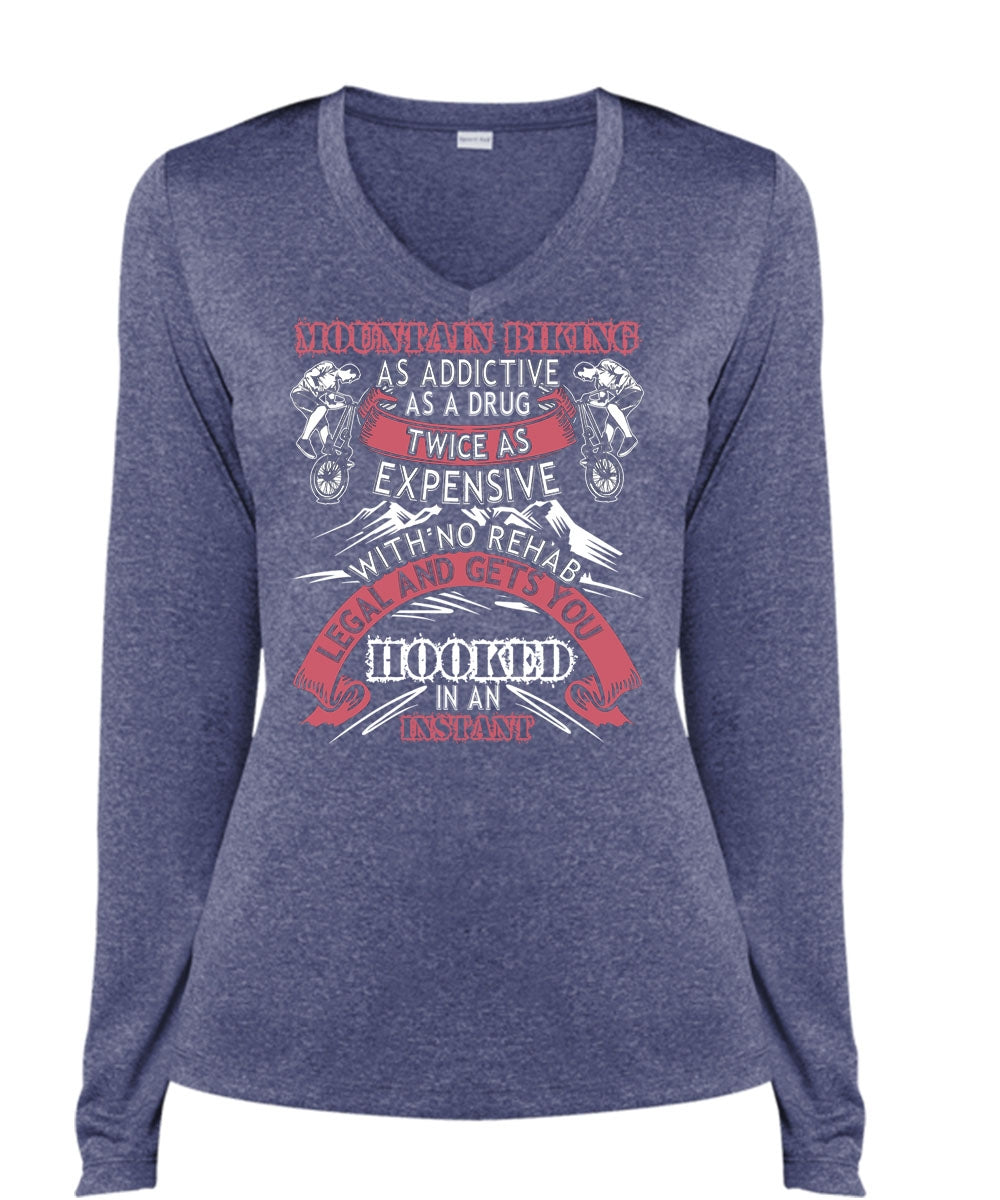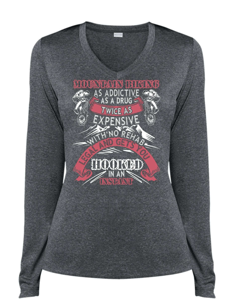Mountain Biking T Shirt, Gets You Hooked T Shirt, Cool Shirt (Ladies LS Heather V-Neck)