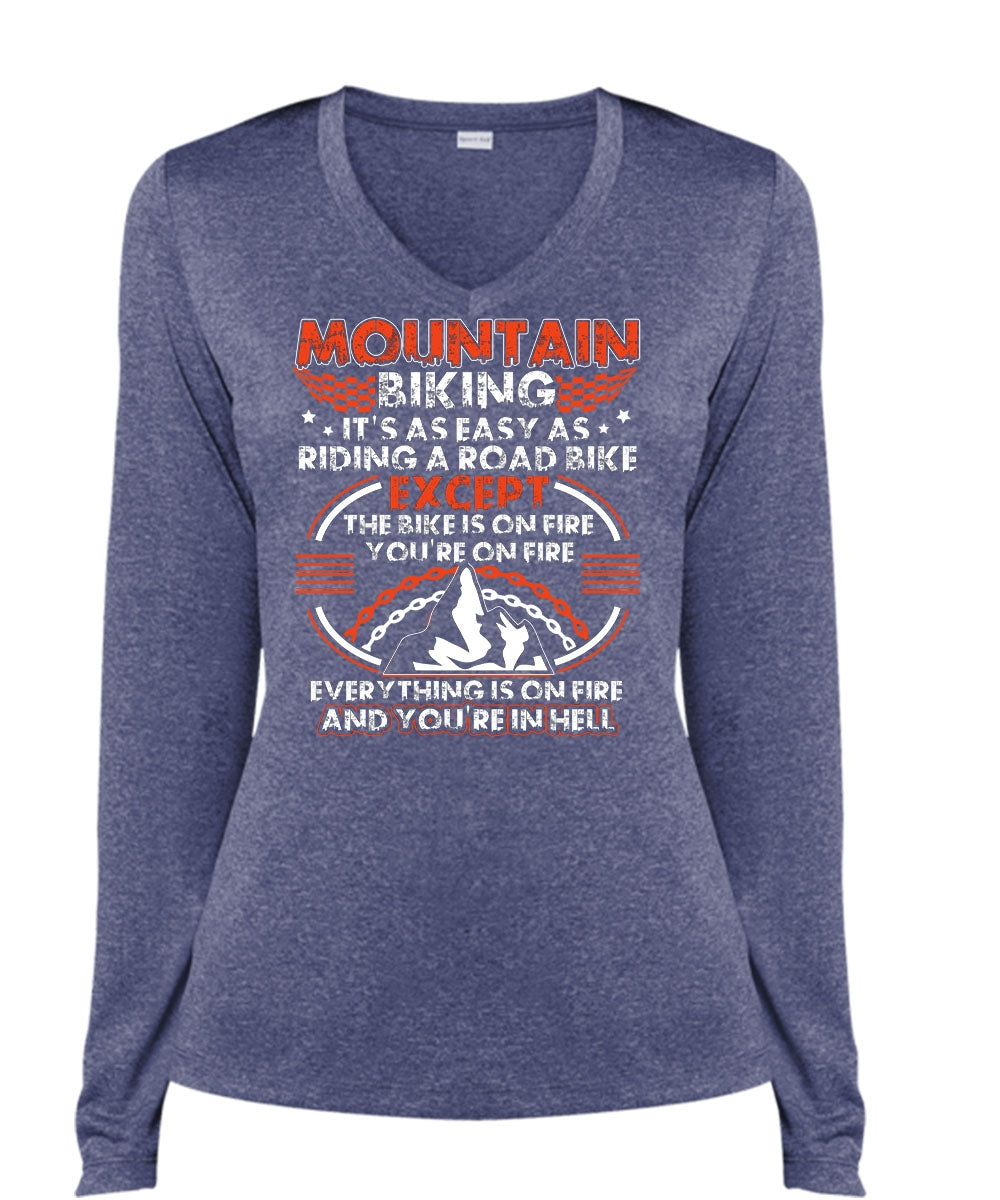 Mountain Biking T Shirt, Riding A Road Bike T Shirt, Cool Shirt (Ladies LS Heather V-Neck)