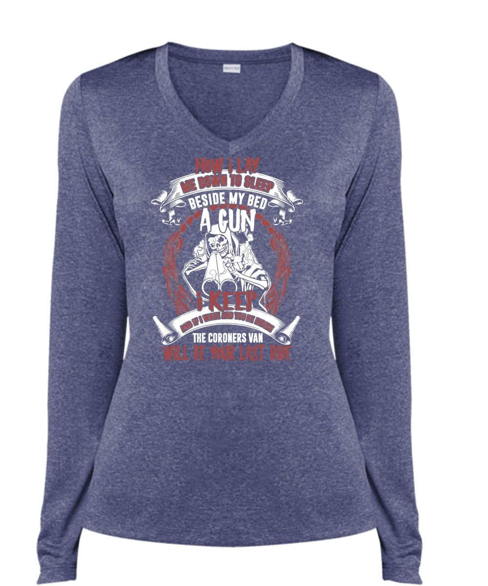 My Bed A Gun T Shirt, Me Down To Sleep T Shirt, Cool Shirt (Ladies LS Heather V-Neck)