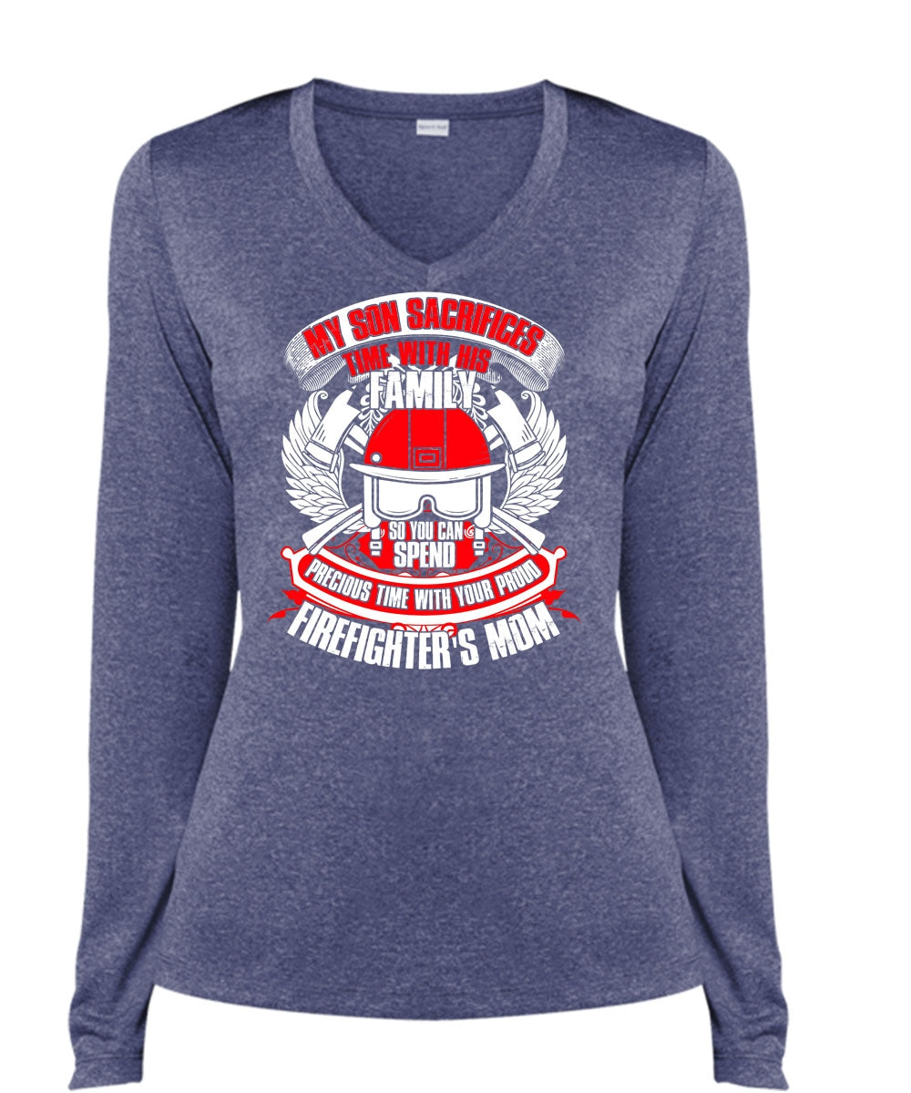 My Son Sacrifices Time T Shirt, Firefighter's Mom T Shirt, Cool Shirt (Ladies LS Heather V-Neck)