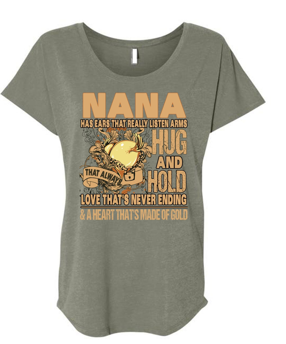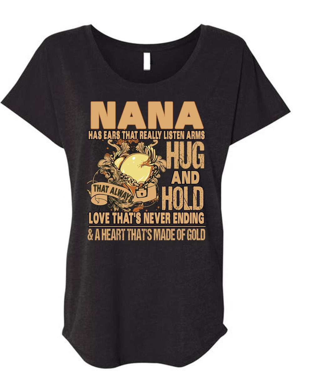 Nana Has Ears T Shirt, Hug And Hold T Shirt, Cool Shirt (Ladies' Triblend Dolman Sleeve)