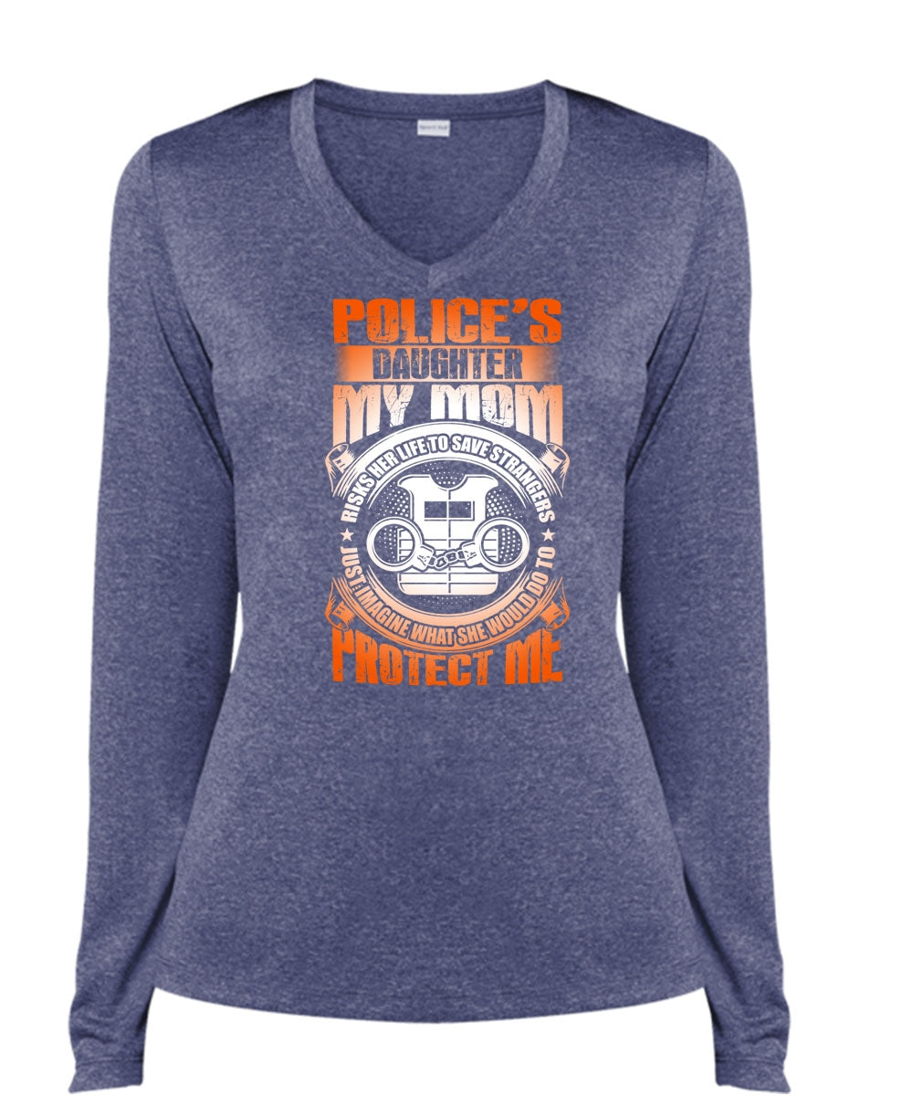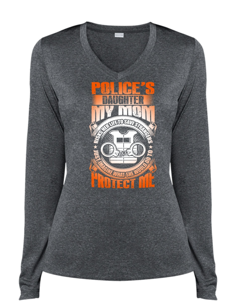 Police's Daughter T Shirt, My Mom Risks Her Life T Shirt, Cool Shirt (Ladies LS Heather V-Neck)