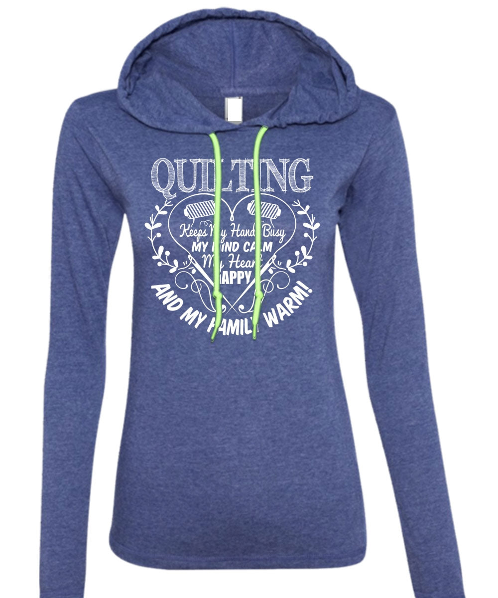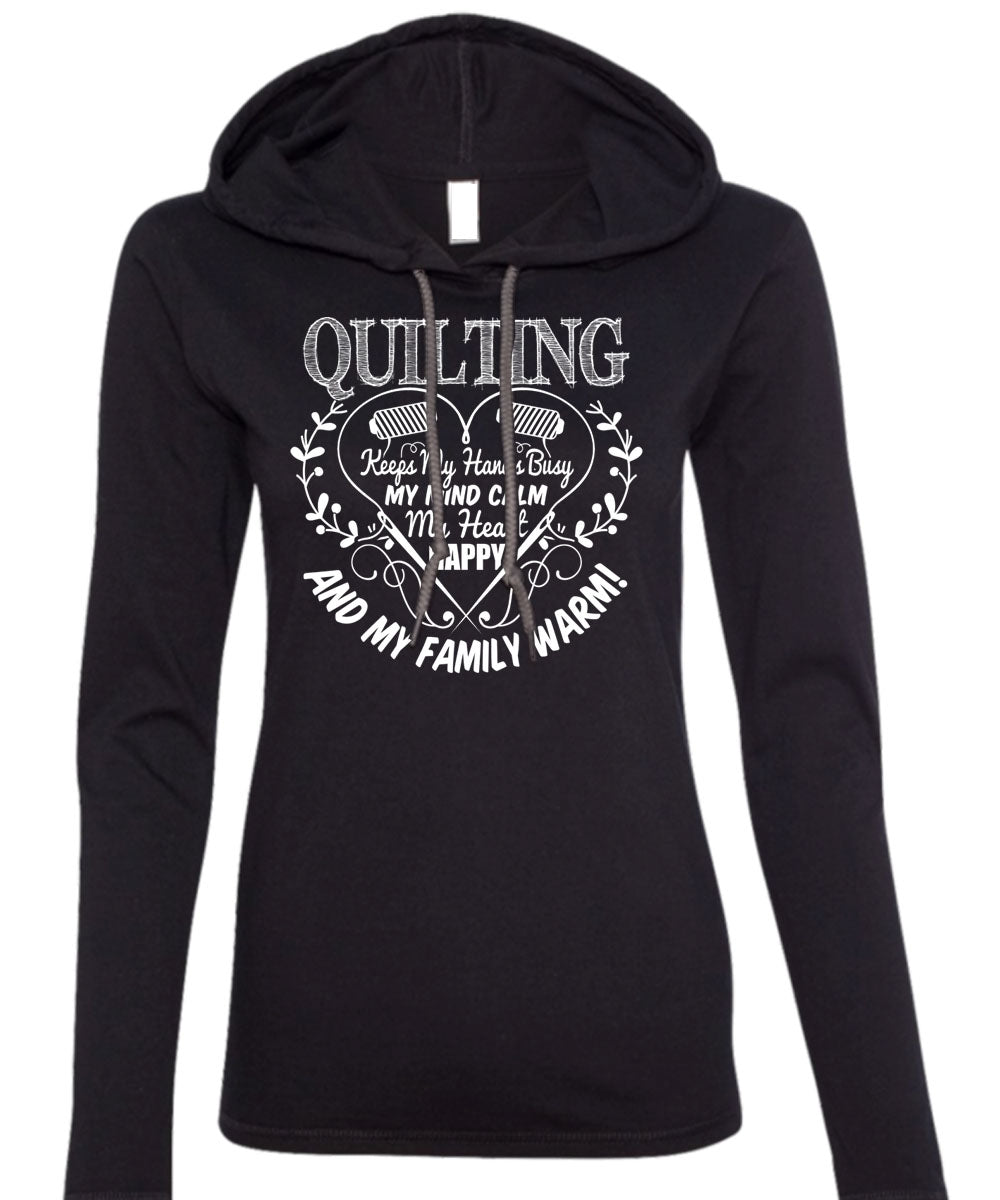 Quilting Keeps My Hands Busy T Shirt, My Family Warm T Shirt (Anvil Ladies Ringspun Hooded)