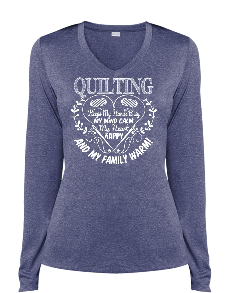 Quilting Keeps My Hands Busy T Shirt, My Family Warm T Shirt, Cool Shirt (Ladies LS Heather V-Neck)