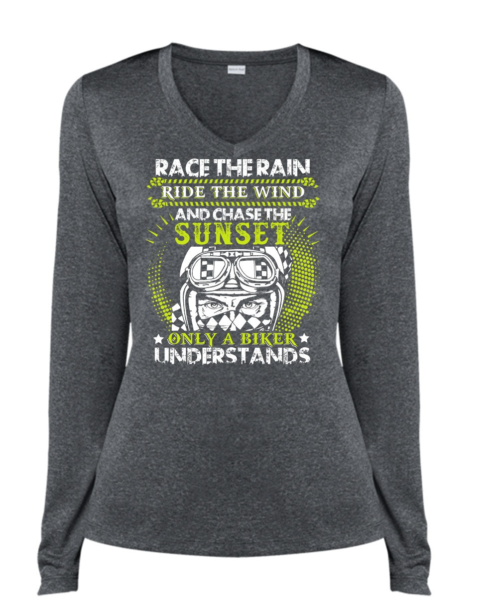 Race The Rain T Shirt, Only A Biker Understands T Shirt, Cool Shirt (Ladies LS Heather V-Neck)