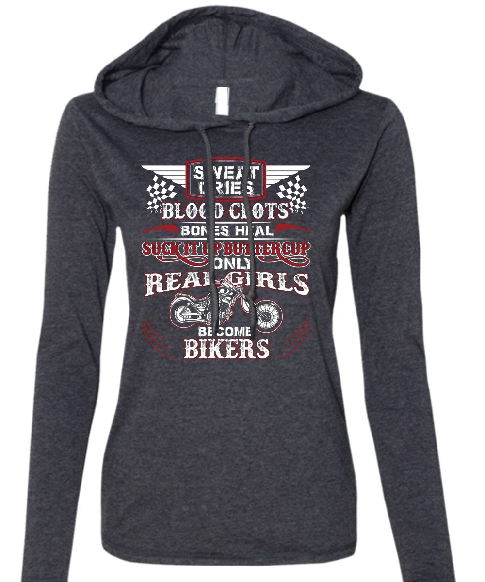 Real Girls Become Bikers T Shirt, Sweat Dries Blood Clots T Shirt (Anvil Ladies Ringspun Hooded)