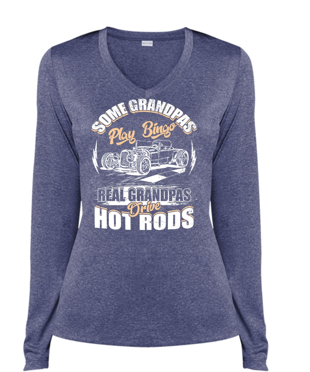 Real Grandpas Drive Hot Rod T Shirt, Grandpas Play Bingo T Shirt, Cool Shirt (Ladies LS Heather V-Neck)