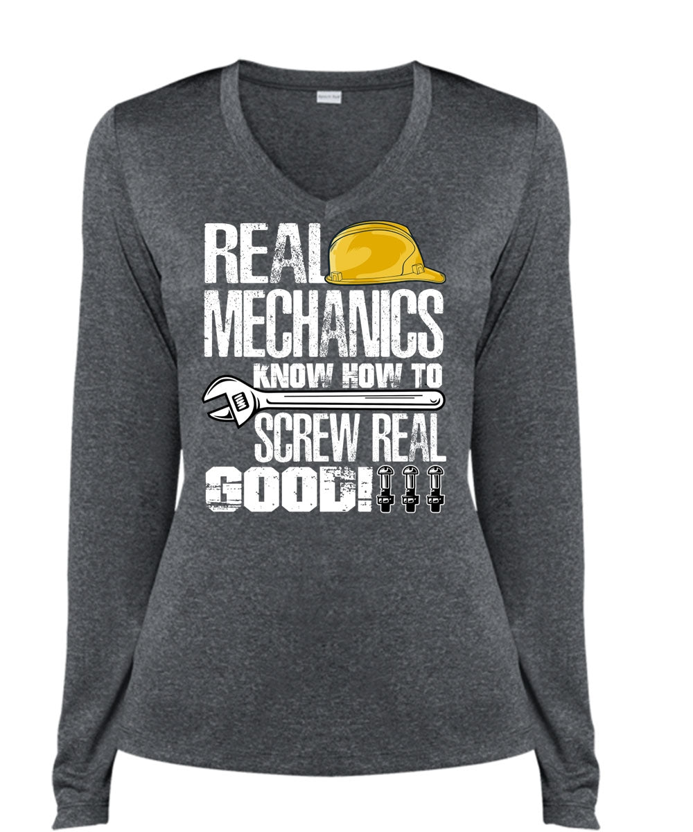 Real Mechanics T Shirt, Being A Mechanic T Shirt, Cool Shirt (Ladies LS Heather V-Neck)