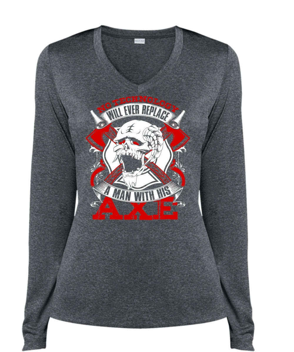 Replace A Man With His AXE T Shirt, Being A Firefighter T Shirt, Cool Shirt (Ladies LS Heather V-Neck)