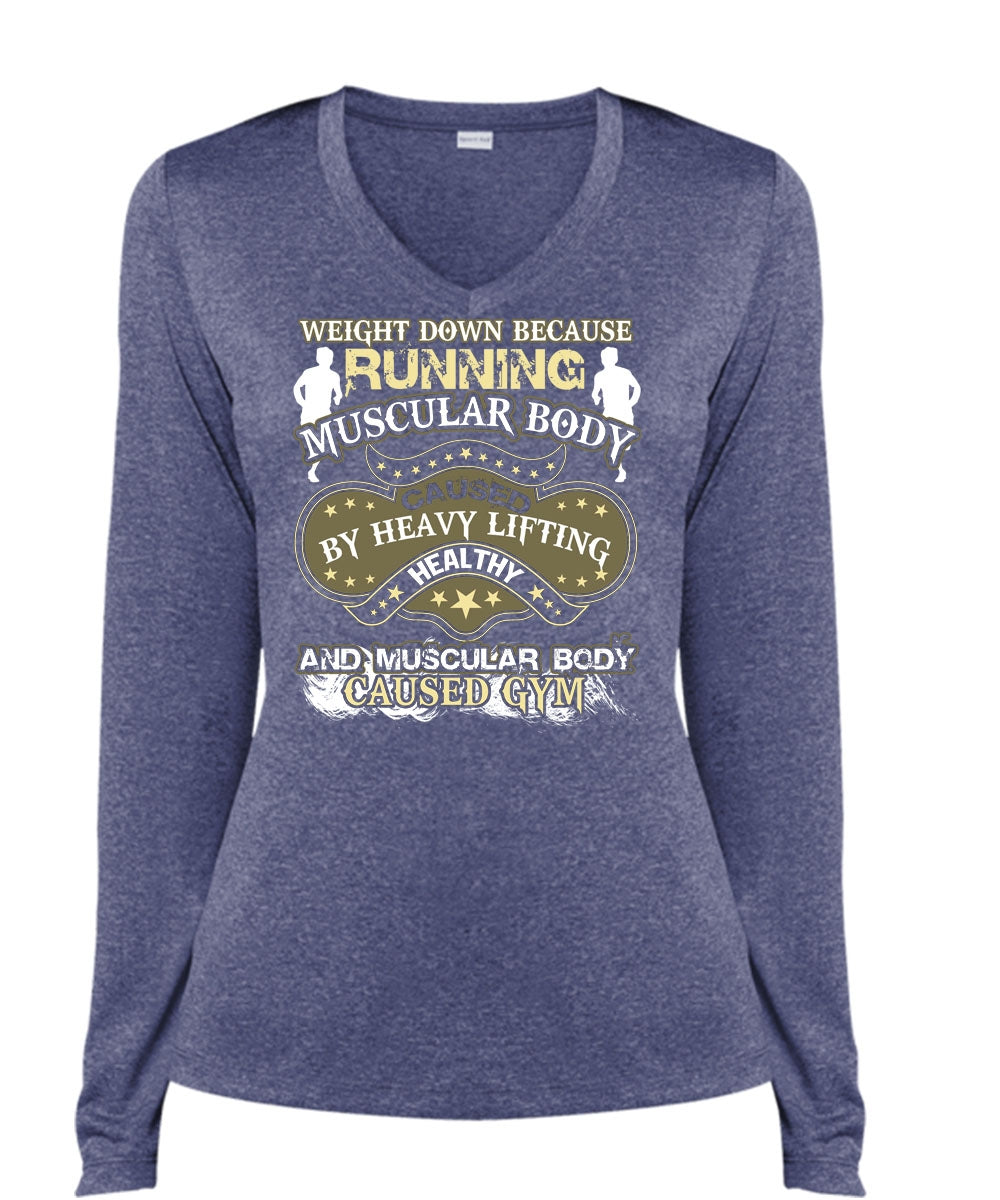 Running Muscular Body T Shirt, Heavy Lifting Healthy T Shirt, Cool Shirt (Ladies LS Heather V-Neck)