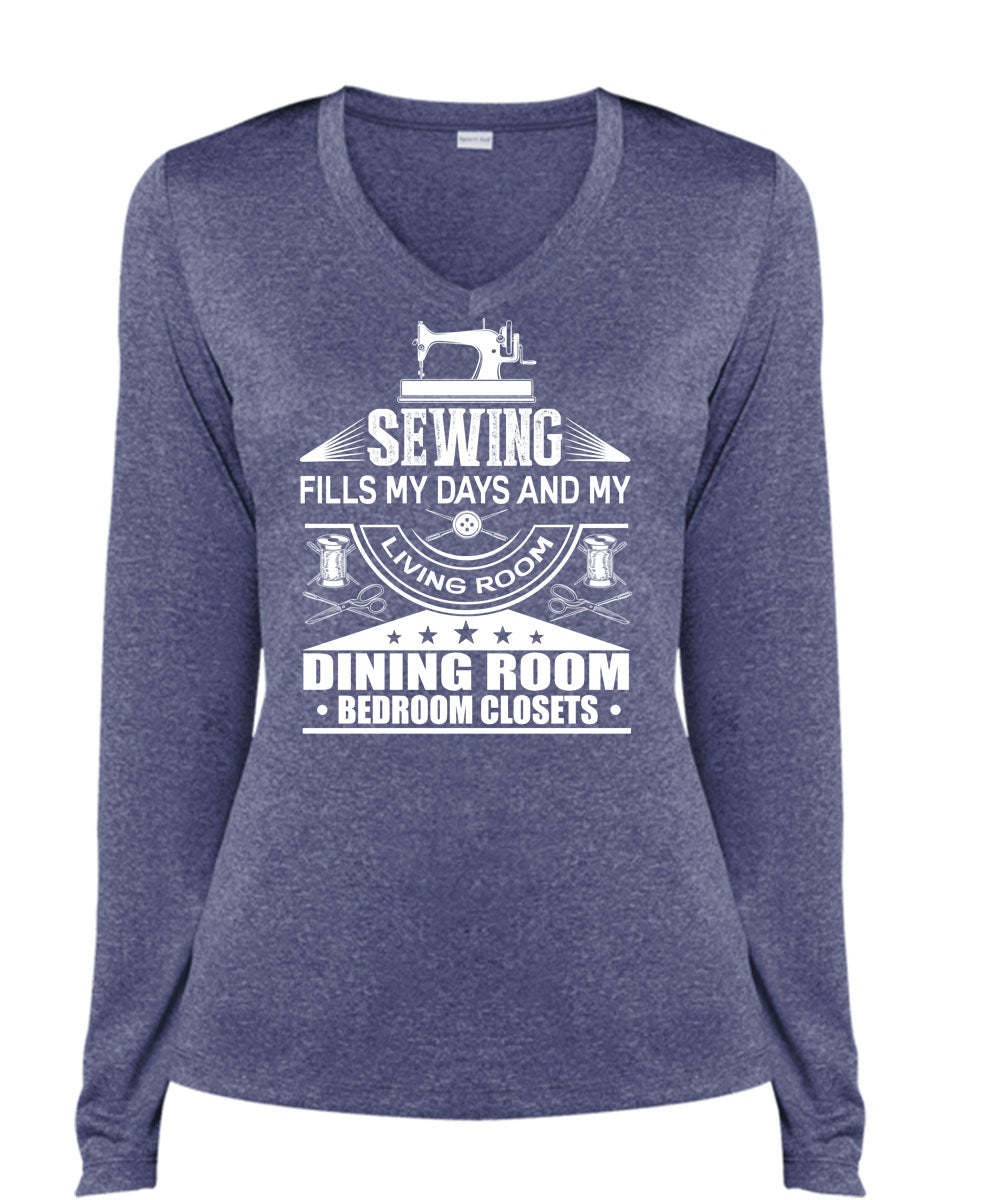 Sewing Fills My Days T Shirt, Dining Room T Shirt, Cool Shirt (Ladies LS Heather V-Neck)