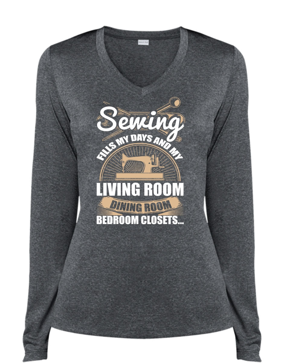 Sewing Fills My Days T Shirt, Living Room Dining Room T Shirt, Cool Shirt (Ladies LS Heather V-Neck)