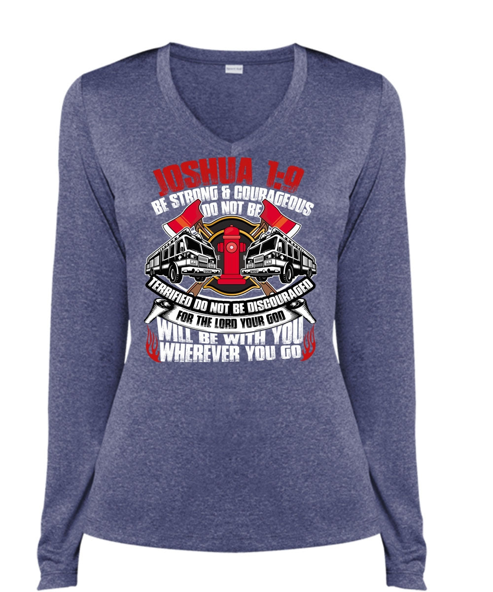 Strong And Courageous Do Not Be T Shirt, Being A Firefighter T Shirt, Cool Shirt (Ladies LS Heather V-Neck)