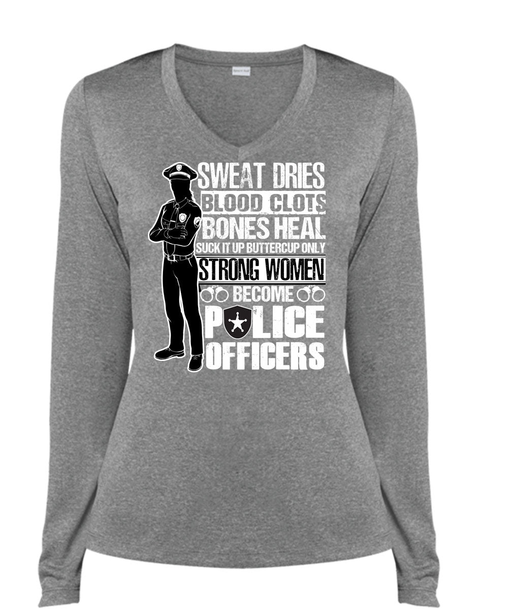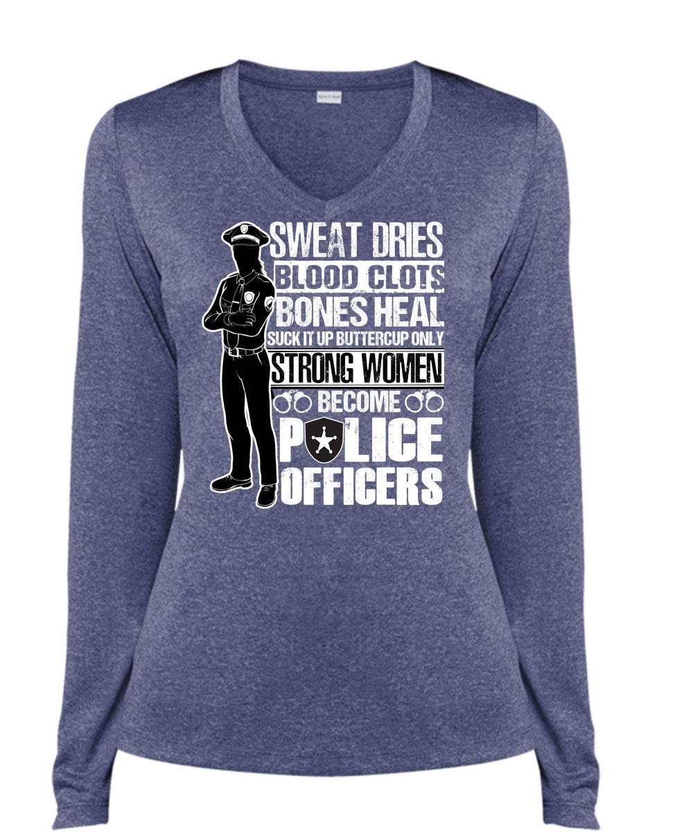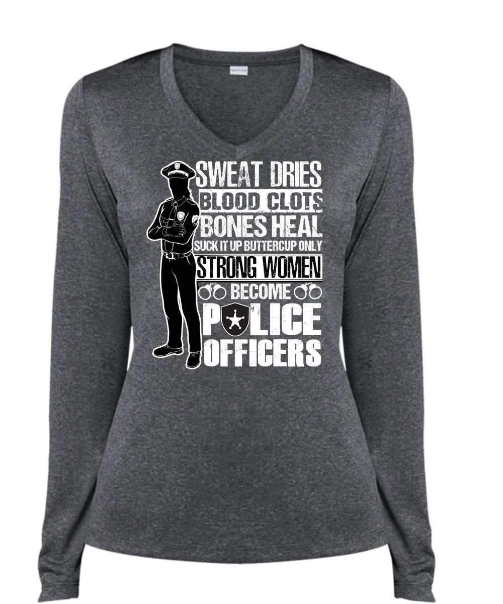 Strong Women Become Police Officers T Shirt, Sweat Dries T Shirt, Cool Shirt (Ladies LS Heather V-Neck)