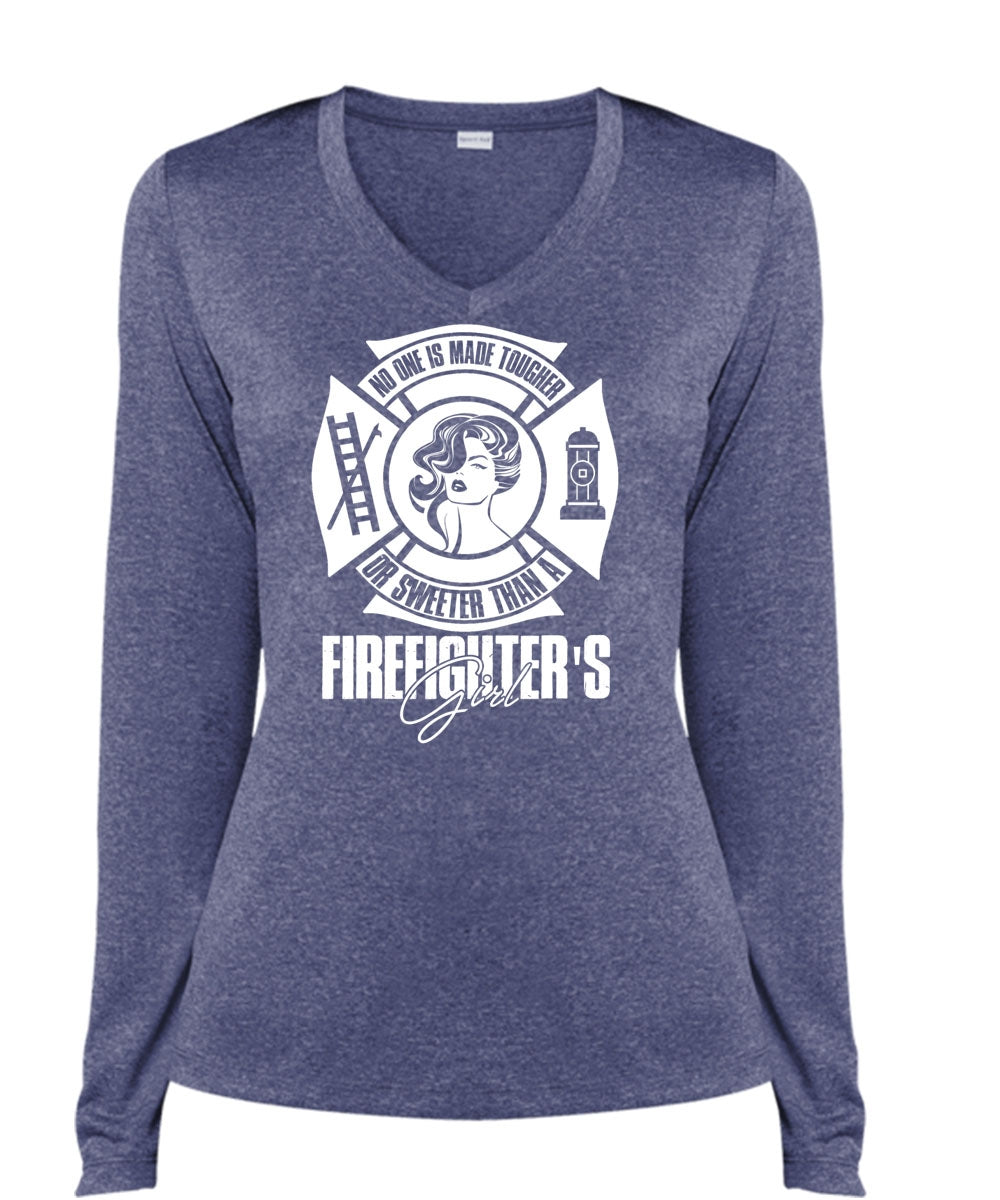 Sweetest Than A Firefighter's Girl T Shirt, Being A Firefighter T Shirt, Cool Shirt (Ladies LS Heather V-Neck)