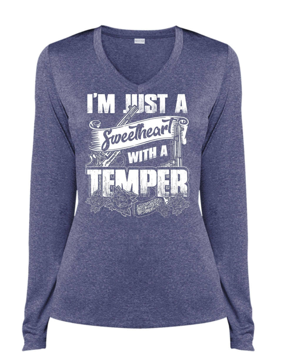 Sweetheart With A Temper T Shirt, Being A Hunter T Shirt, Cool Shirt (Ladies LS Heather V-Neck)