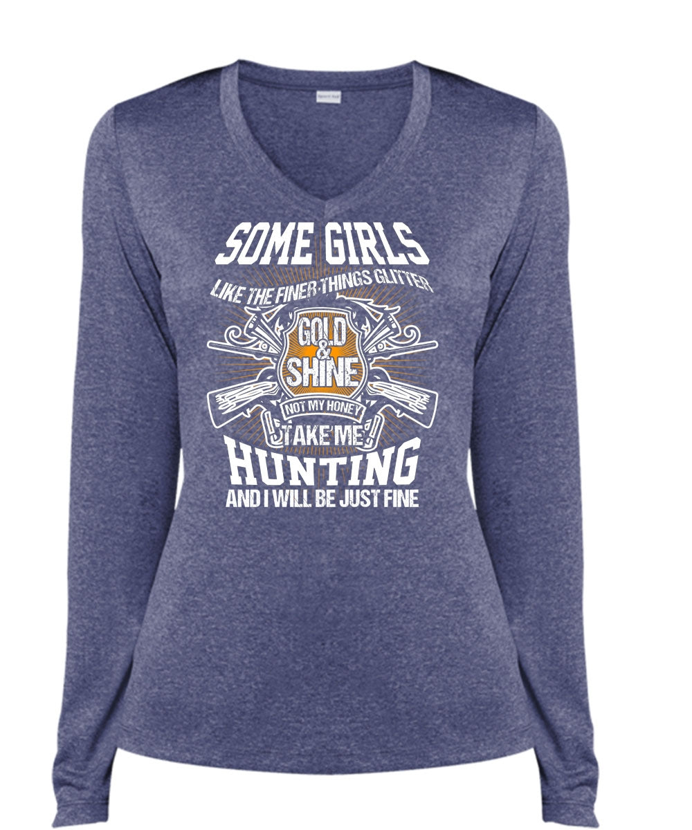 Take Me Hunting T Shirt, Gold And Shine T Shirt, Cool Shirt (Ladies LS Heather V-Neck)