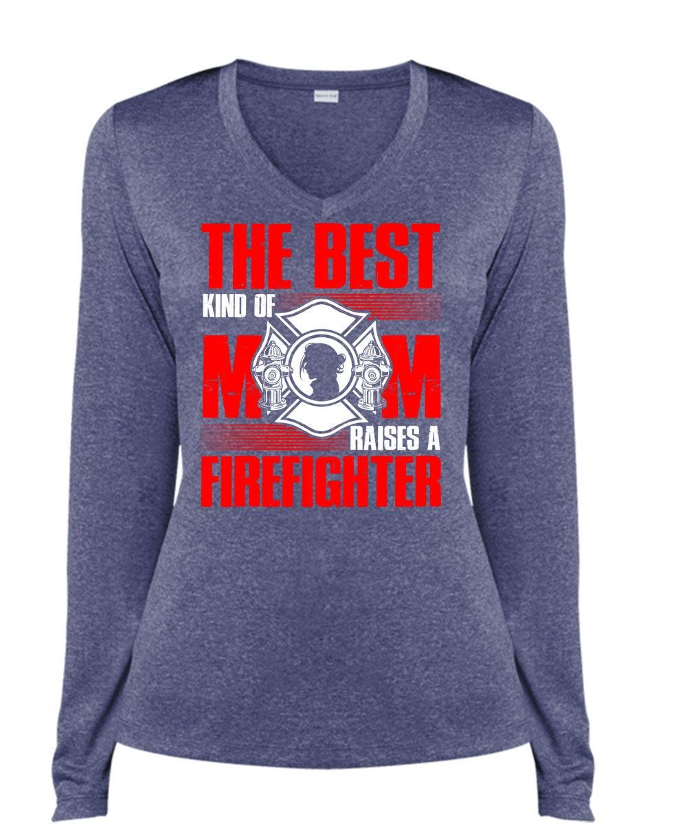 The Best Kind Of Mom T Shirt, Raises A Firefighter T Shirt, Cool Shirt (Ladies LS Heather V-Neck)