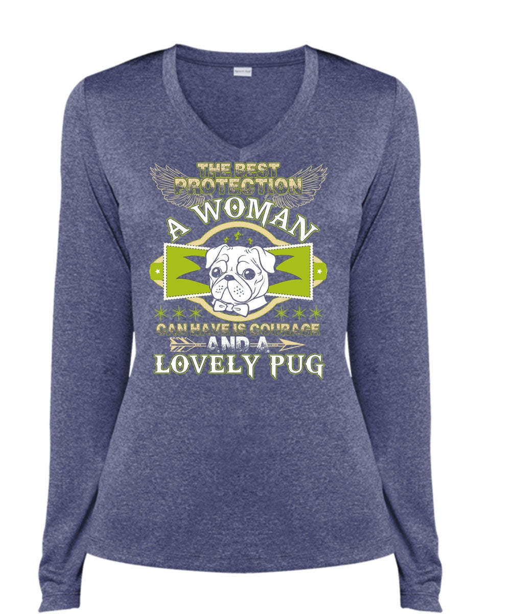 The Best Protection A Woman T Shirt, I Love Pug T Shirt, Cool Shirt (Ladies LS Heather V-Neck)