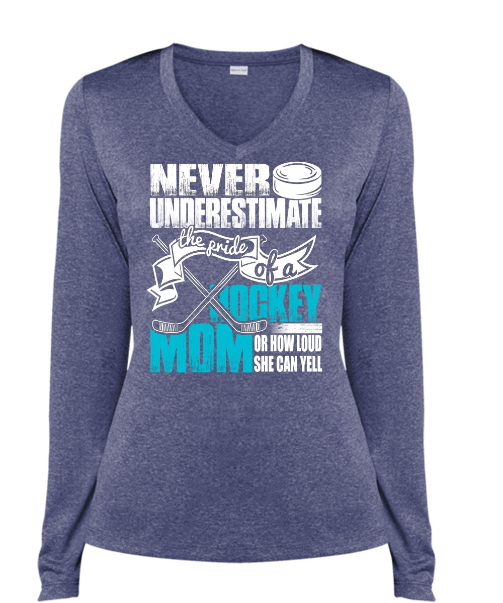 The Pride Of A Hockey Mom T Shirt, She Can Yell T Shirt, Cool Shirt (Ladies LS Heather V-Neck)