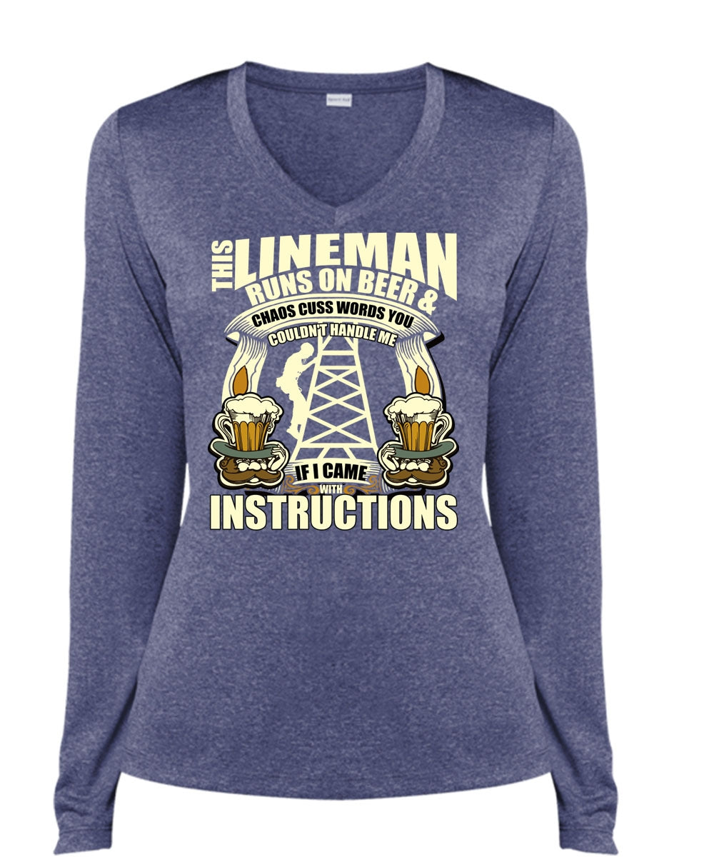 This Lineman Runs On Beer T Shirt, I Came With Instructions T Shirt, Cool Shirt (Ladies LS Heather V-Neck)