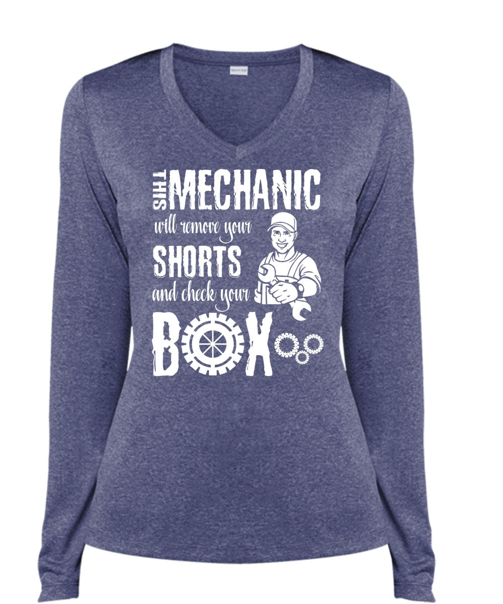 This Mechanic Will Remove Your Shorts T Shirt, Being A Mechanic T Shirt, Cool Shirt (Ladies LS Heather V-Neck)
