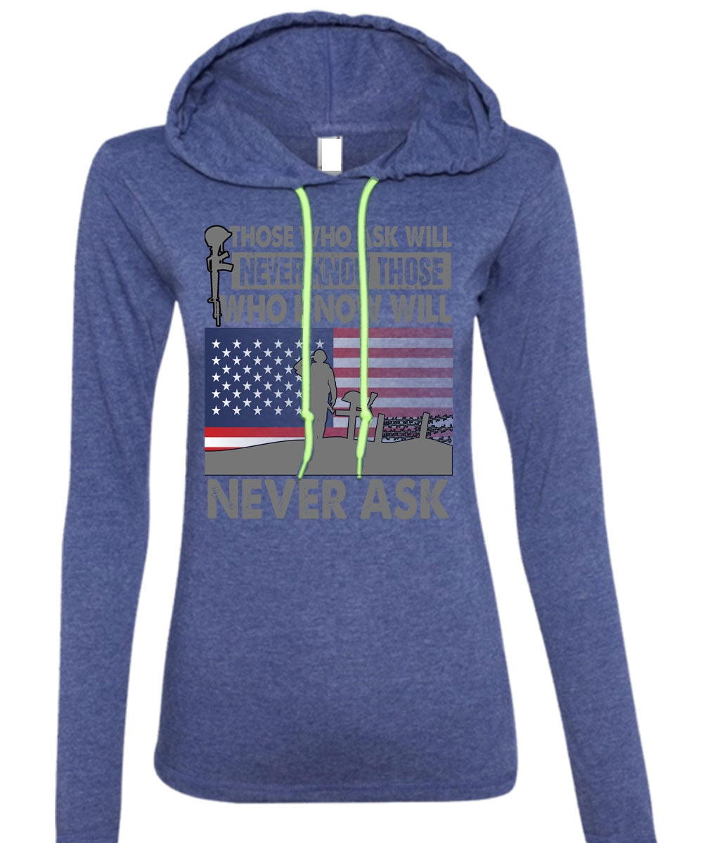 Those Who Ask Will Never Know T Shirt, Being A Veteran T Shirt (Anvil Ladies Ringspun Hooded)