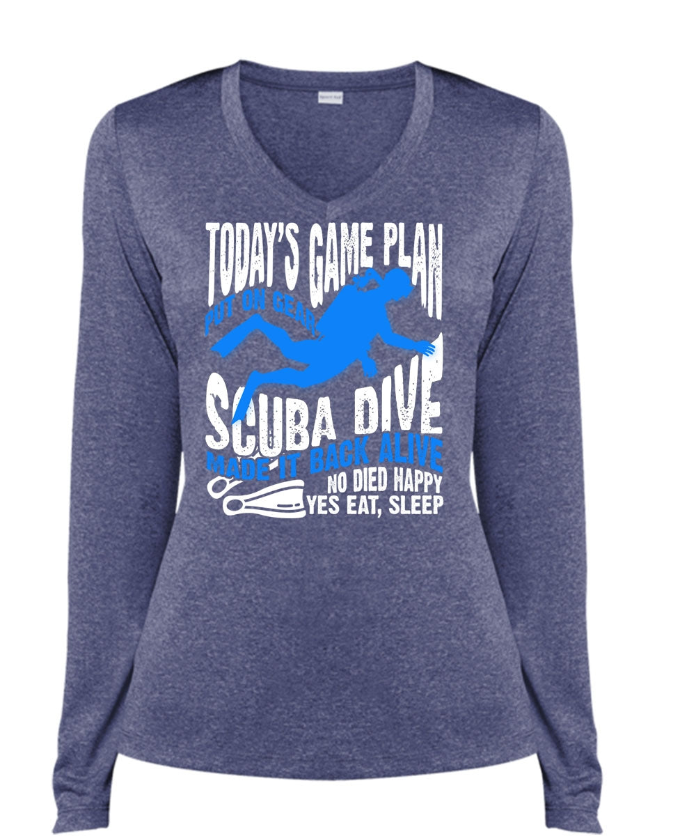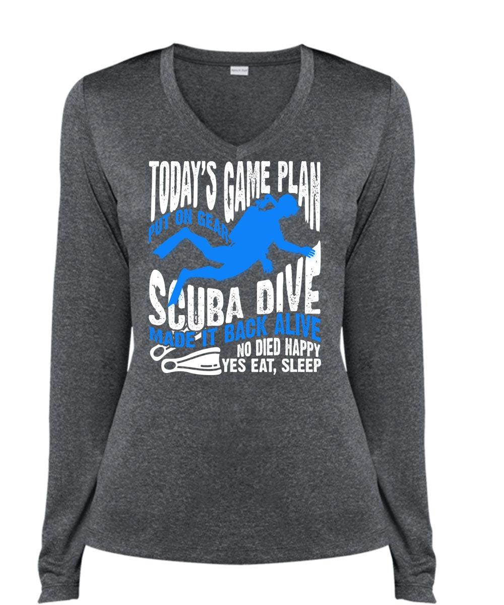 Today's Game Plan T Shirt, Put On Gear Scuba Dive T Shirt, Cool Shirt (Ladies LS Heather V-Neck)