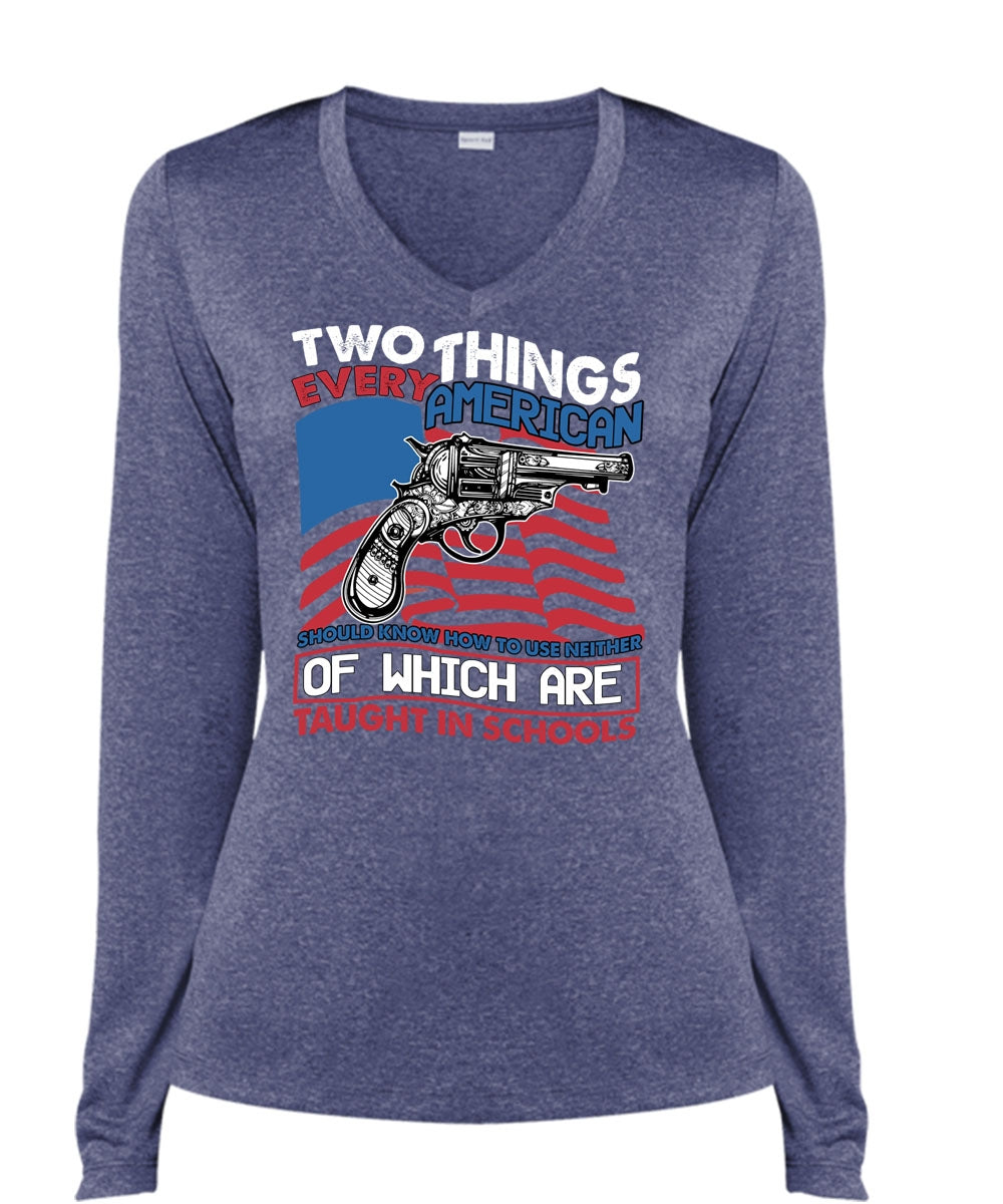 Two Things Every American T Shirt, Being A Gunner T Shirt, Cool Shirt (Ladies LS Heather V-Neck)