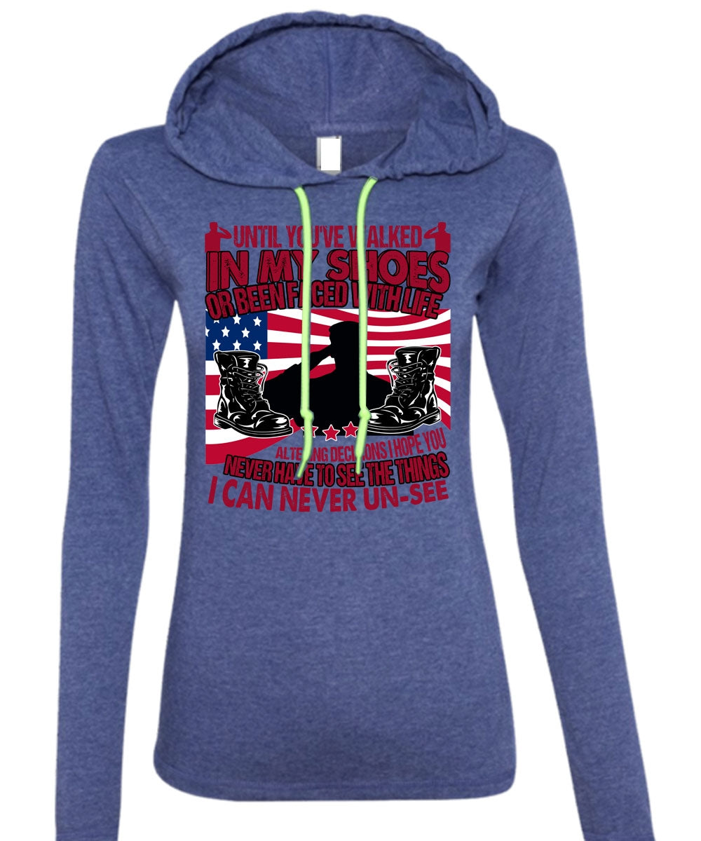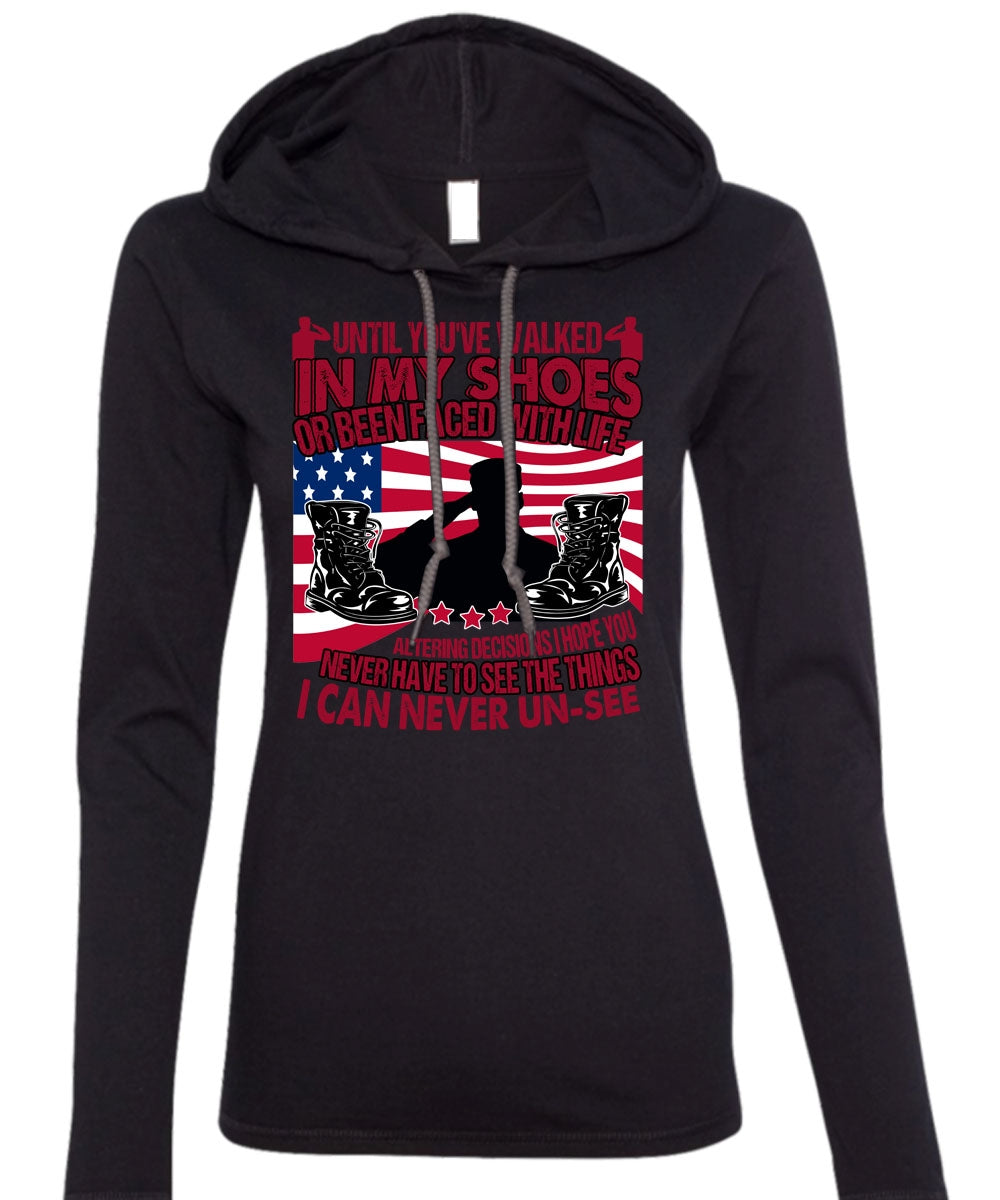 Until You've Walked In My Shoes T Shirt, Being A Veteran T Shirt (Anvil Ladies Ringspun Hooded)