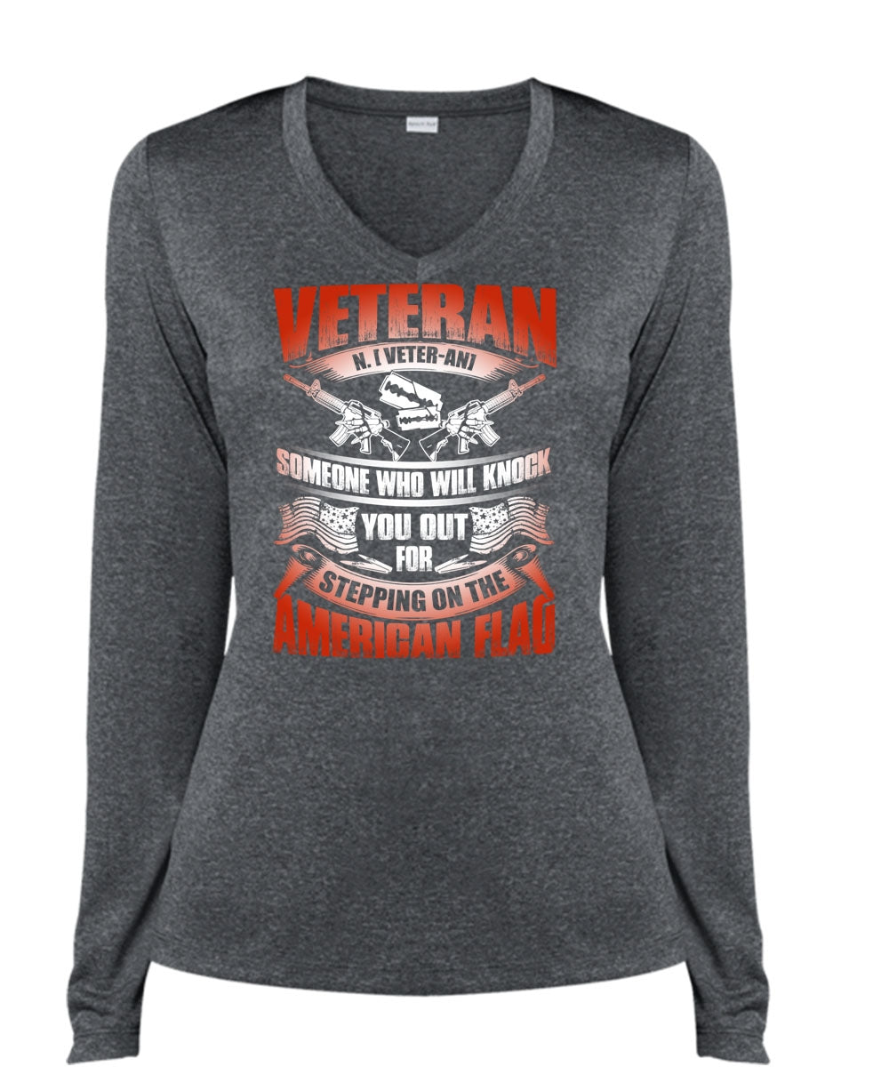 Veteran Who Will Knock You Out T Shirt, American Flag T Shirt, Cool Shirt (Ladies LS Heather V-Neck)