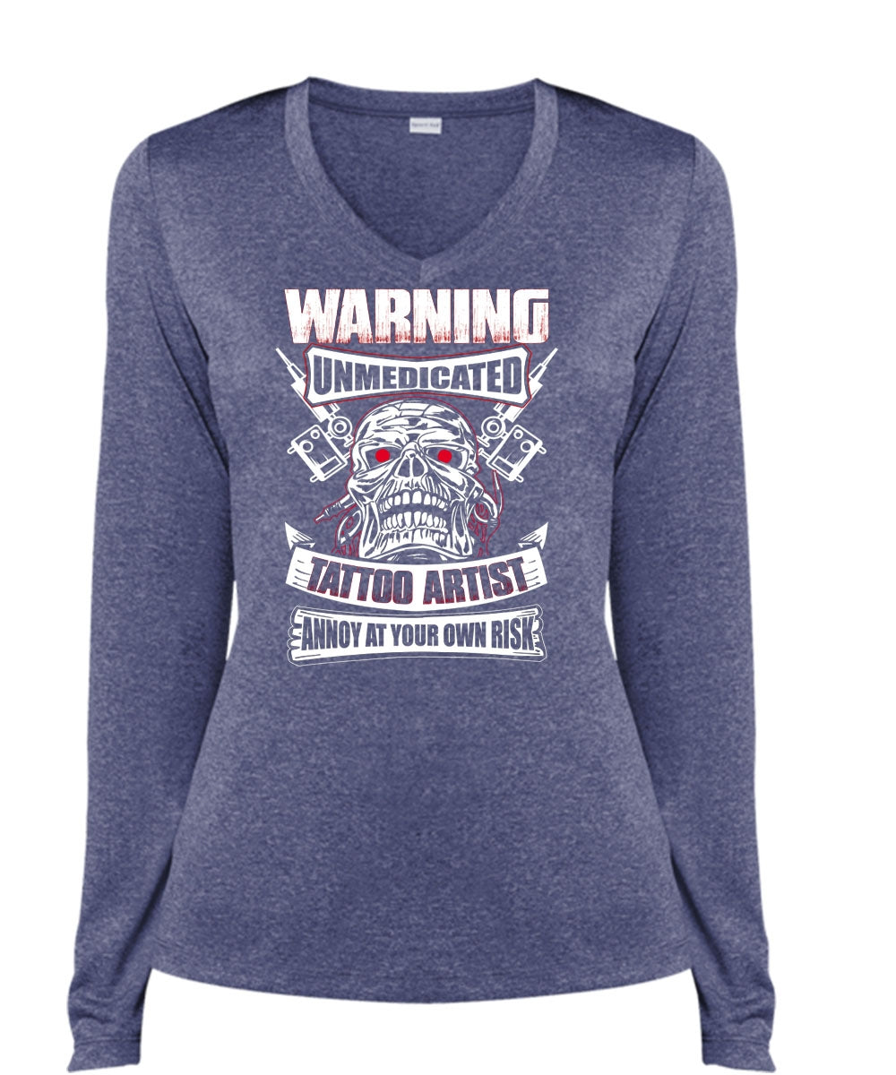 Warning Unmedicated Tattoo Artist T Shirt, My Favorite T Shirt, Cool Shirt (Ladies LS Heather V-Neck)