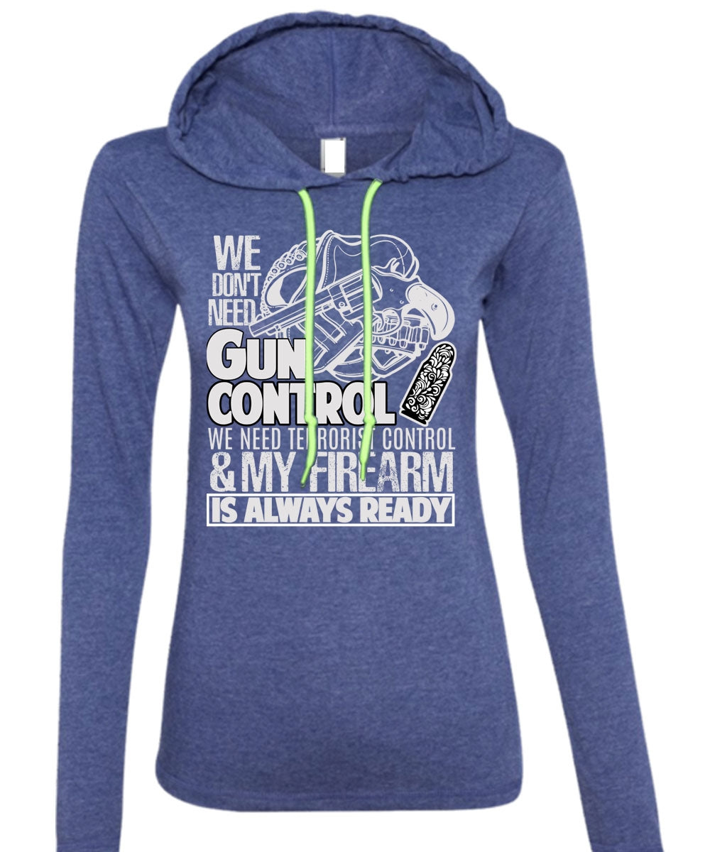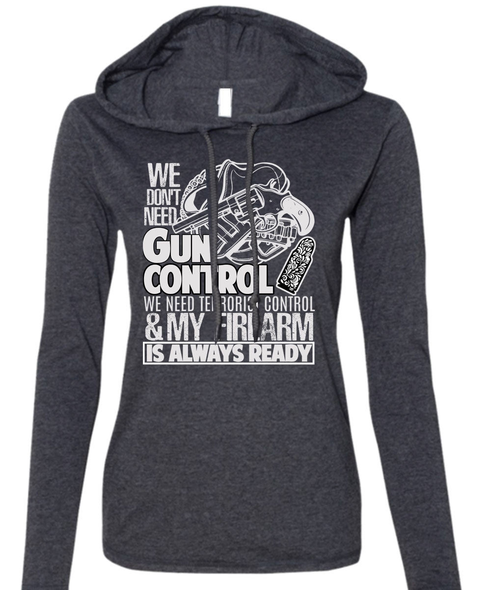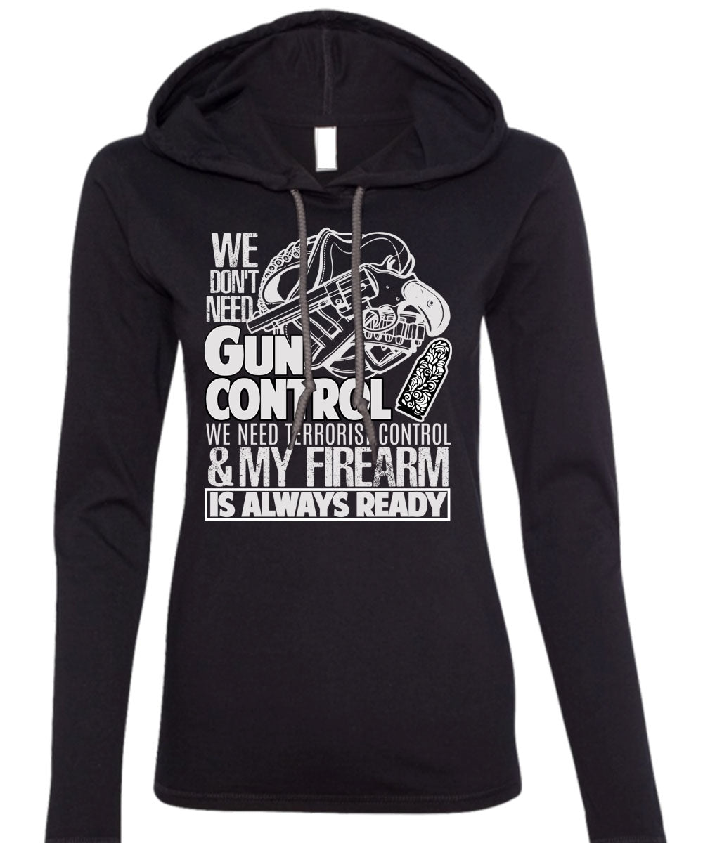 We Don't Need Gun Control T Shirt, My Firearm T Shirt (Anvil Ladies Ringspun Hooded)