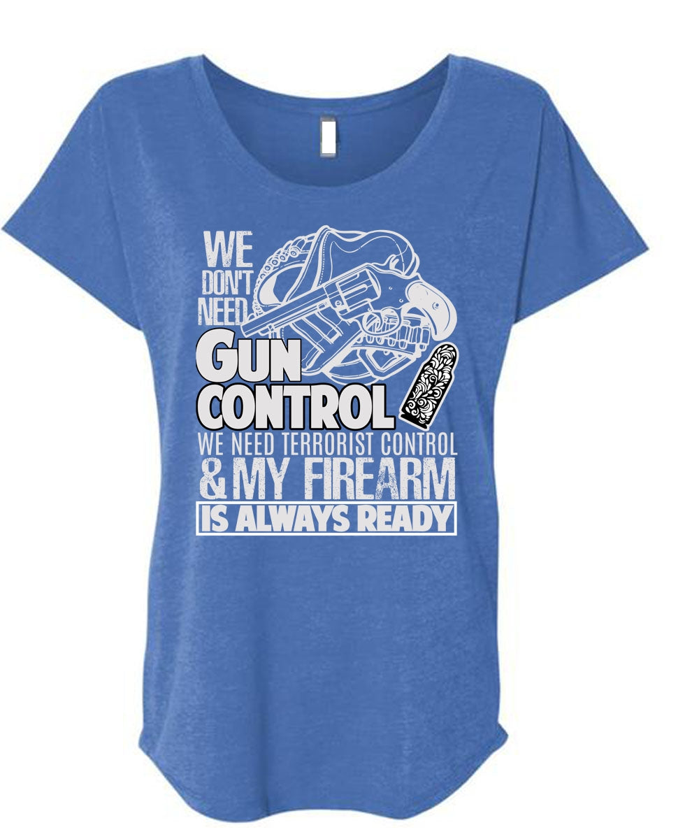 We Don't Need Gun Control T Shirt, My Firearm T Shirt, Cool Shirt (Ladies' Triblend Dolman Sleeve)