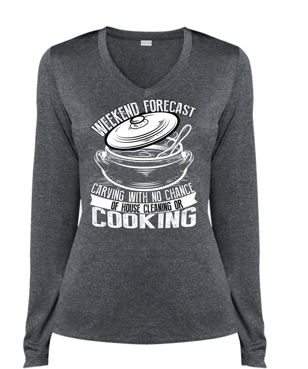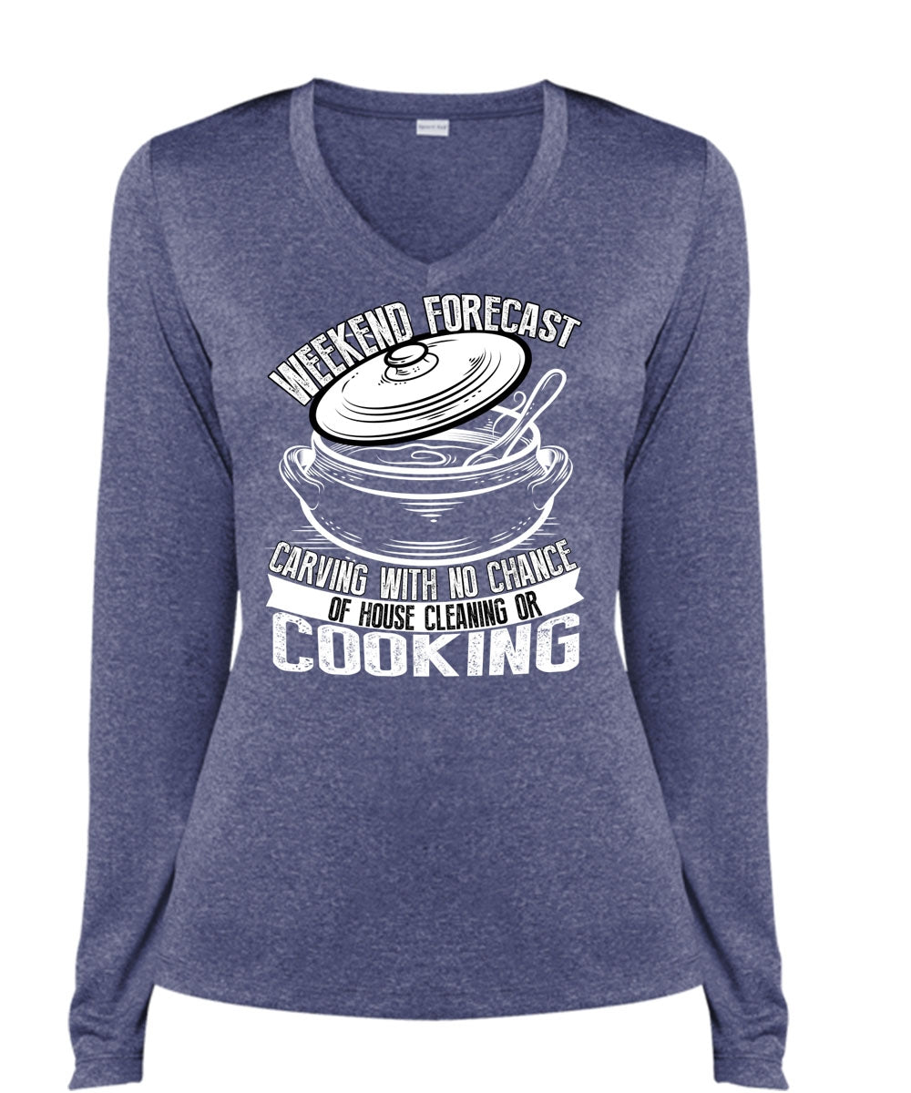 Weekend Forecast Carving T Shirt, House Cleaning Or Cooking T Shirt, Cool Shirt (Ladies LS Heather V-Neck)