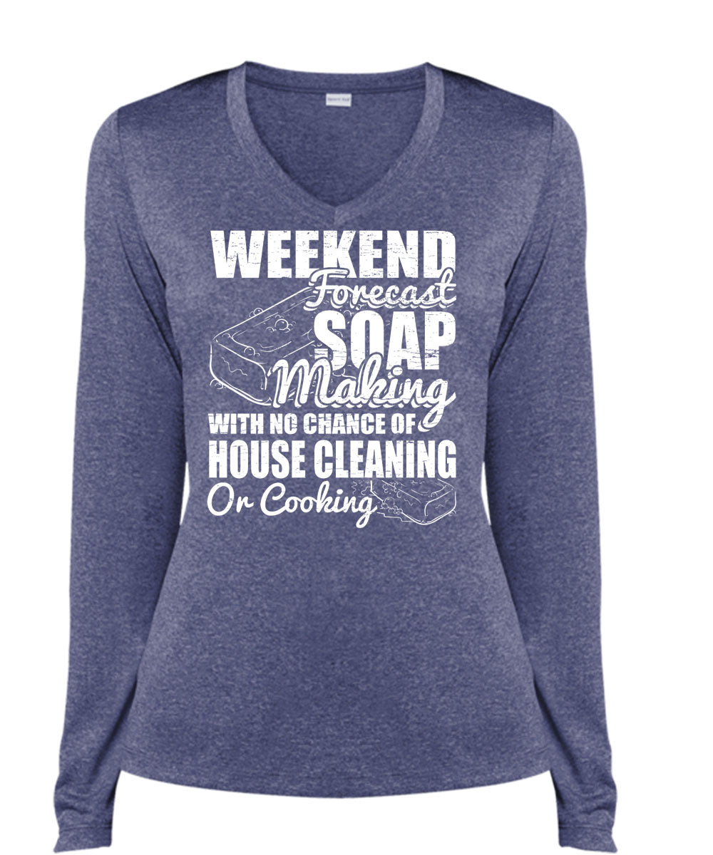 Weekend Forecast Soap Making T Shirt, House Cleaning T Shirt, Cool Shirt (Ladies LS Heather V-Neck)
