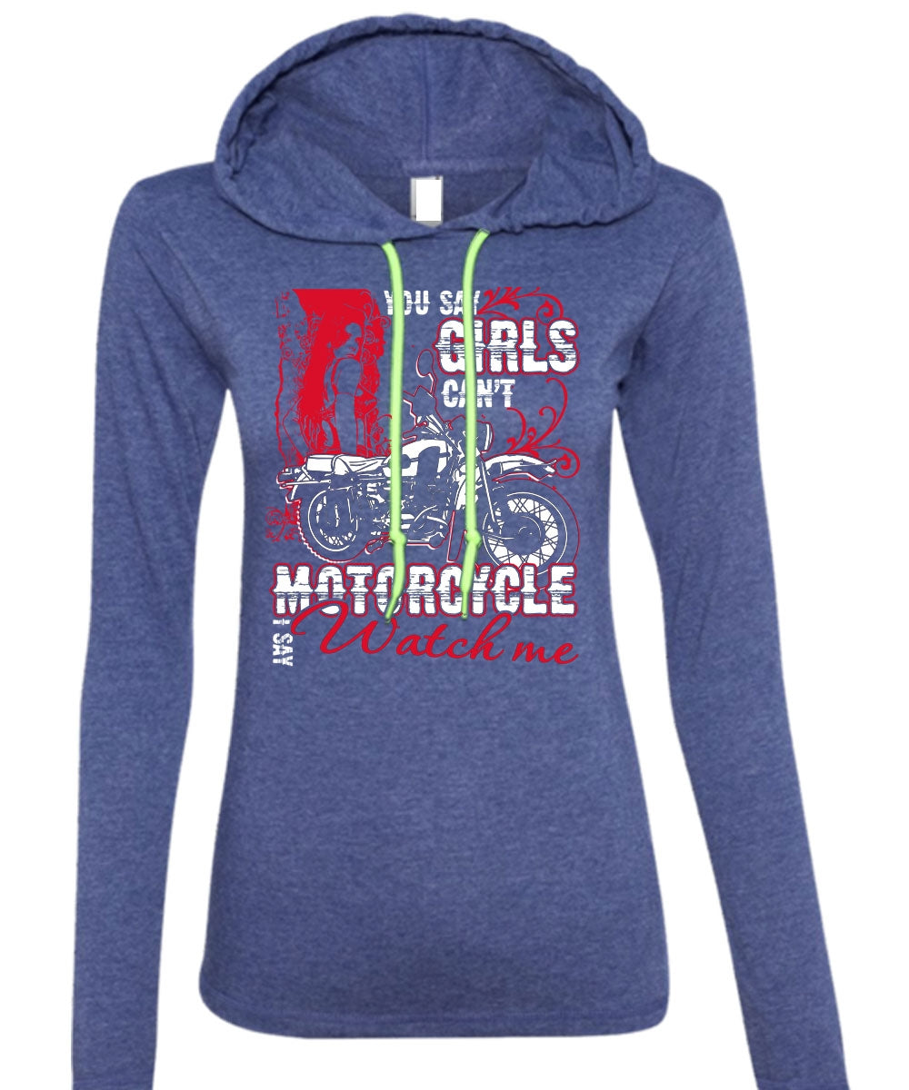 You Say Girls Can't Motorcycle T Shirt, I Say Watch Me T Shirt (Anvil Ladies Ringspun Hooded)