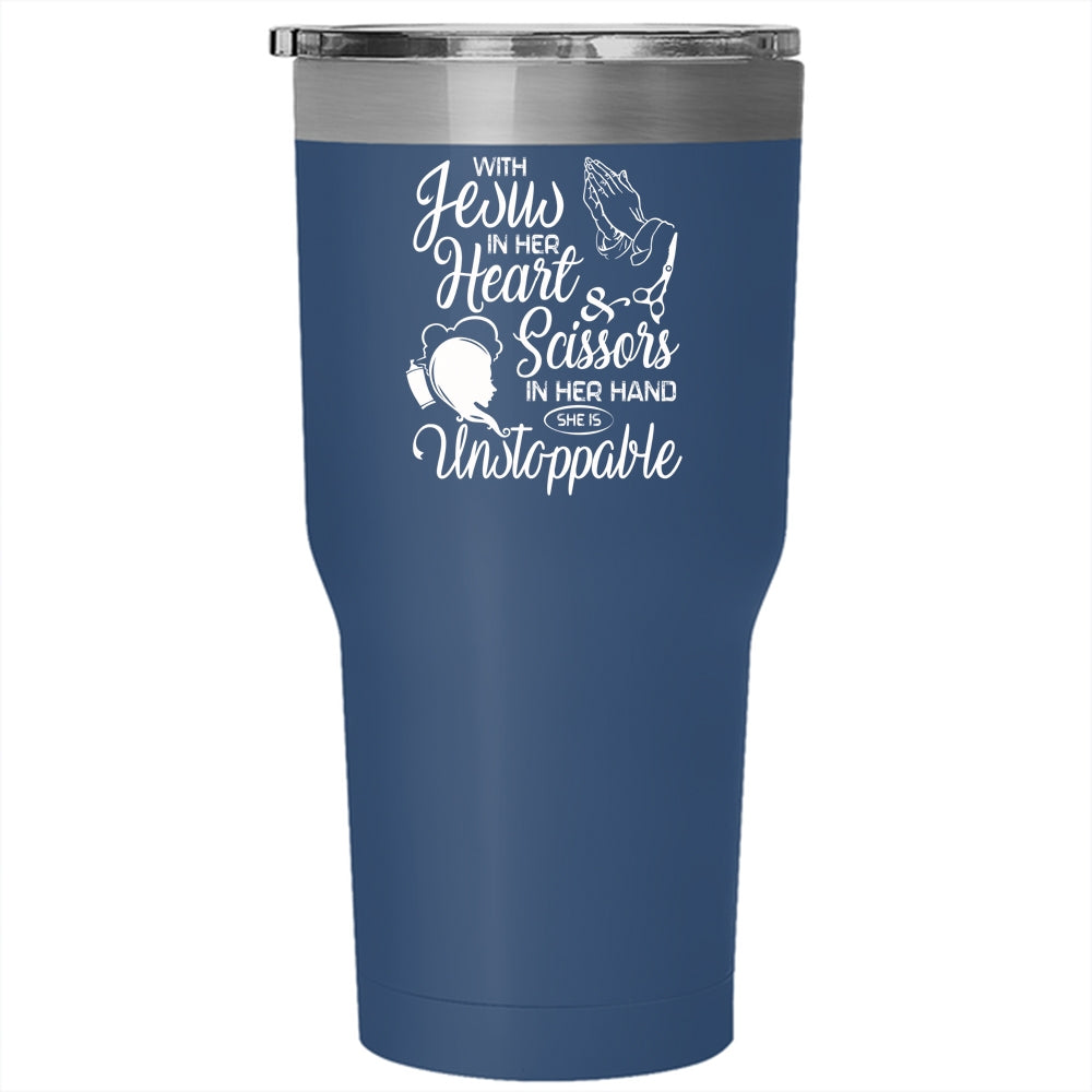 With Scissors In Her Hand Tumbler 30 oz Stainless Steel, She Is Unstoppable Travel Mug