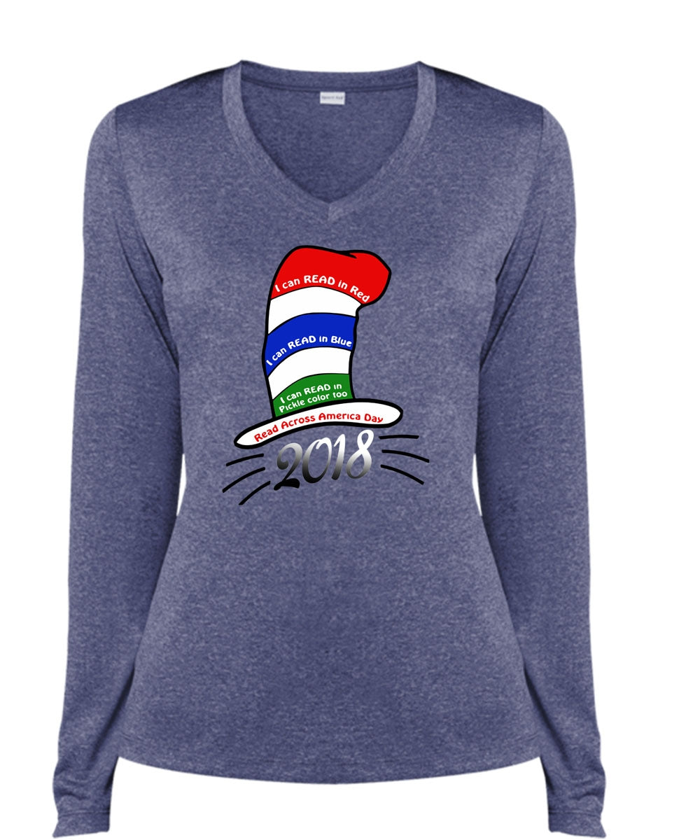 Dr. Seuss T Shirt, I Can Read In Red T Shirt, The Cat in the Hat T Shirt, I Can Read In Blue T Shirt, Cool Shirt (Ladies LS Heather V-Neck)