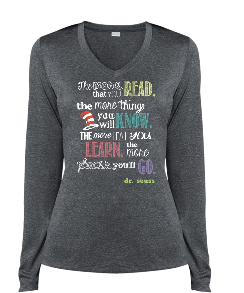 Dr. Seuss T Shirt, The More Things You Will Know T Shirt, The Cat in the Hat T Shirt, You Learn T Shirt, Cool Shirt (Ladies LS Heather V-Neck)