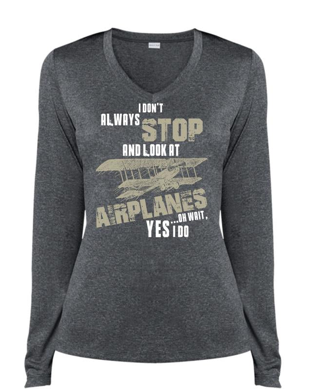 I Don't Always Stop T Shirt, Look At Airplanes T Shirt, Cool Shirt (Ladies LS Heather V-Neck)
