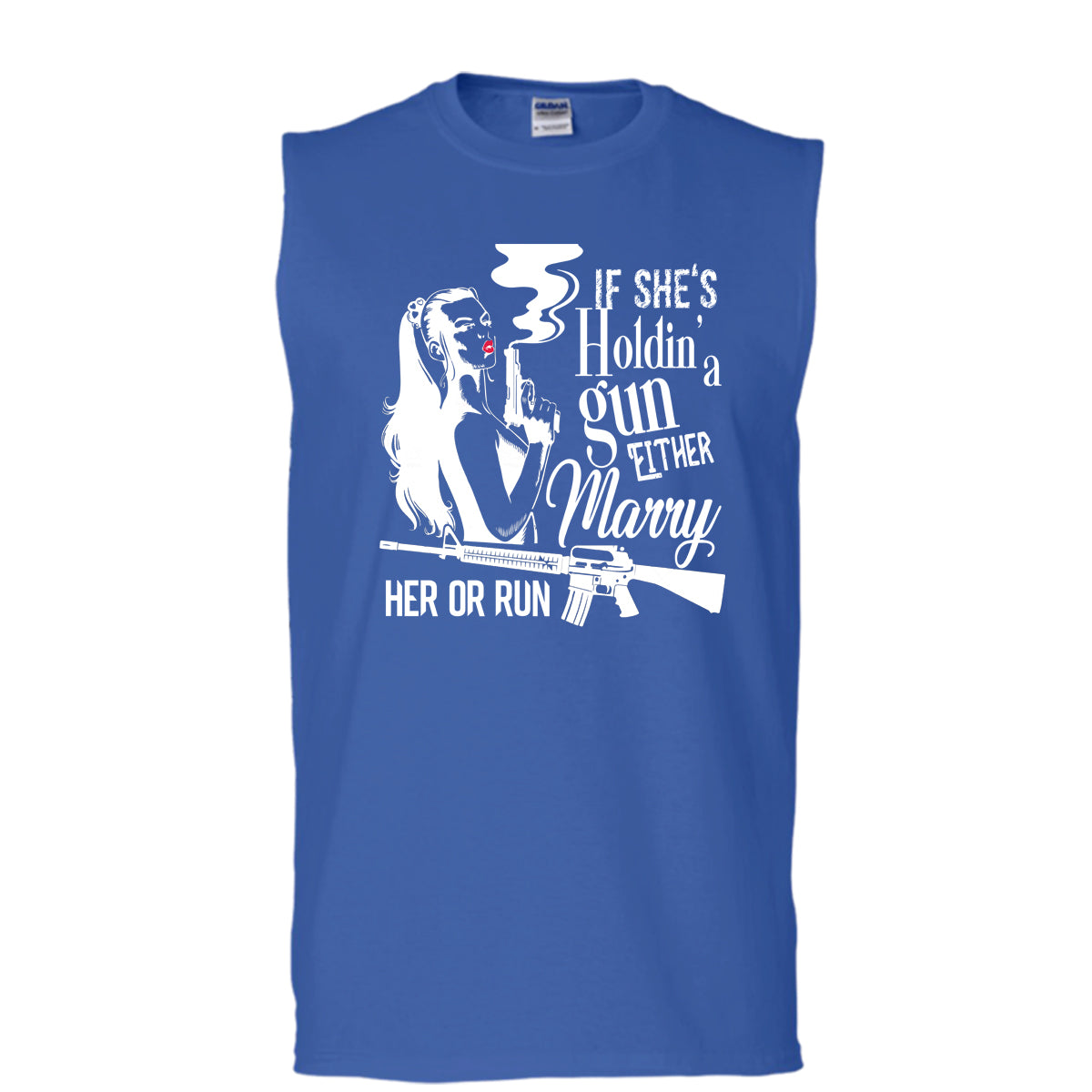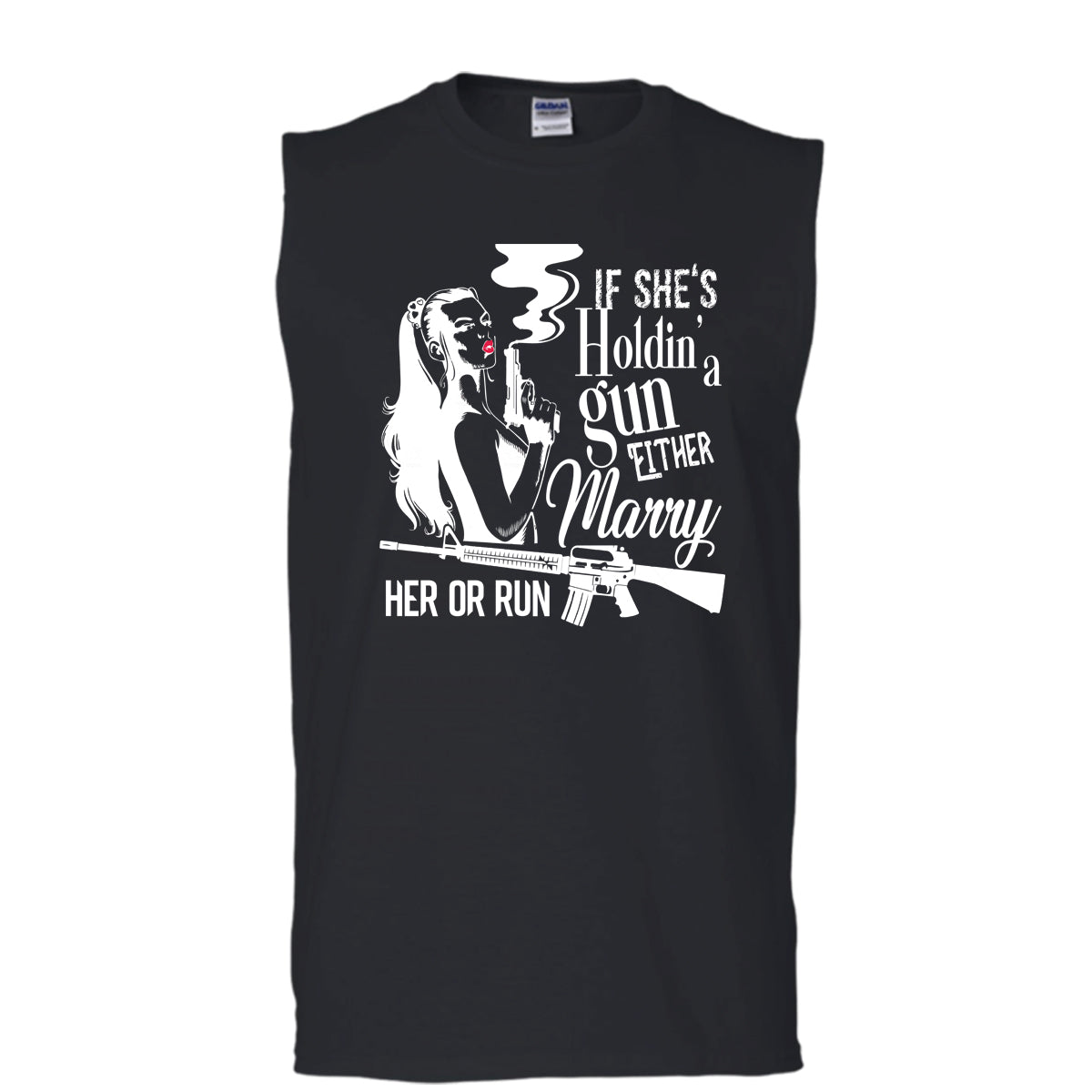 If She's Holdin' A Gun T Shirt, Either Marry Her Or Run T Shirt, Cool T Shirt (Men's Cotton Sleeveless)