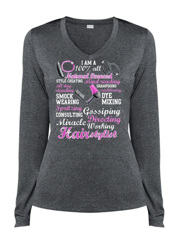 Miracle Working Hair Stylist T Shirt, I Love Hair Stylist T Shirt, Cool Shirt (Ladies LS Heather V-Neck)