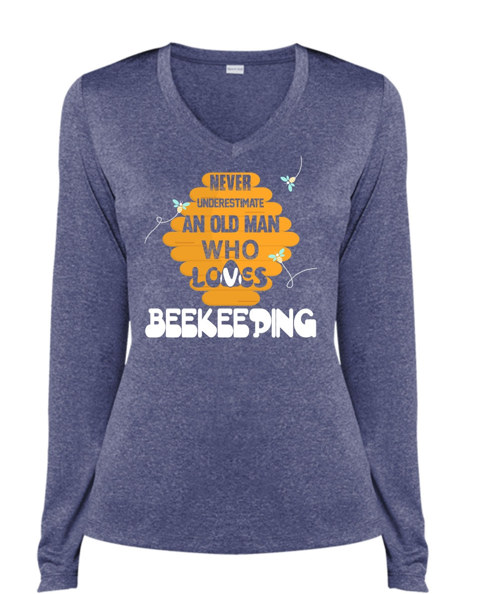 Old Man Who Loves Beekeeping T Shirt, I Love Beekeeping T Shirt, Cool Shirt (Ladies LS Heather V-Neck)
