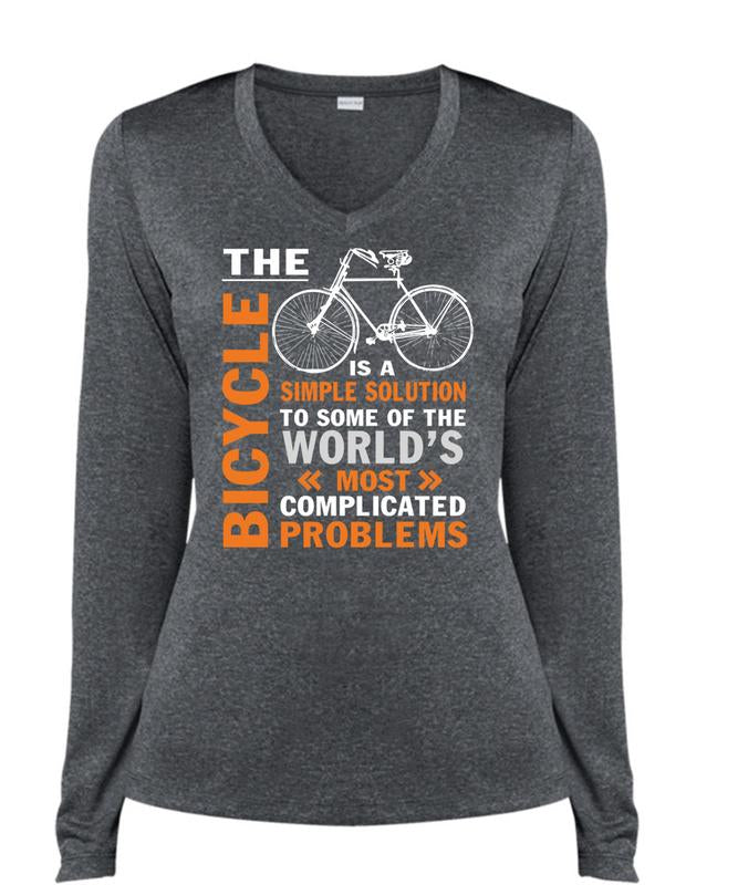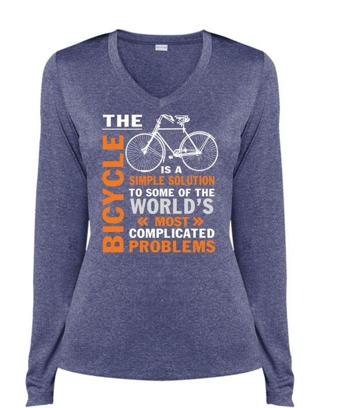 The Bicycle Is A Simple Solution T Shirt, I Love Biking T Shirt, Cool Shirt (Ladies LS Heather V-Neck)